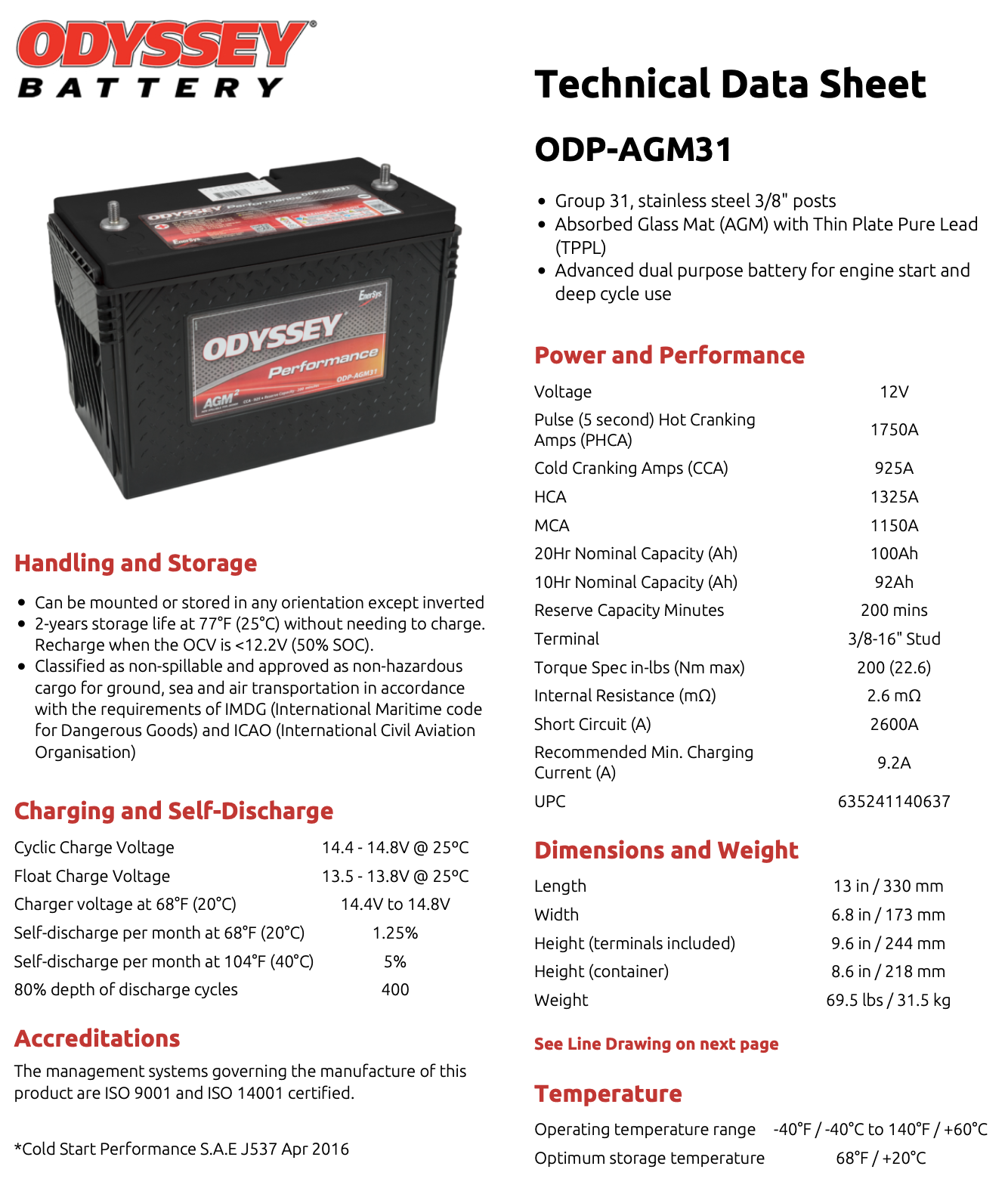 La Batería AGM Odyssey ODP-AGM31 tiene una enorme potencia de arranque y una sorprendente capacidad de ciclo profundo: hasta 400 ciclos con una profundidad de descarga del 80 %. Con el doble de potencia total y el triple de vida útil de las baterías marinas convencionales, la batería ODYSSEY es ideal para pesca por curricán, arranque y para alimentar los muchos accesorios electrónicos a bordo comunes en las embarcaciones y autocaravanas.