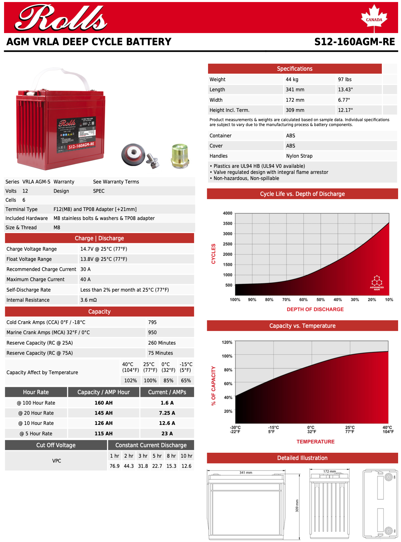 Batería AGM Rolls S12-160AGM-RE 160Ah C100. Las baterías Rolls premium de ciclo profundo se han forjado una reputación de fiabilidad y confianza en el exigente mercado de las energías renovables.