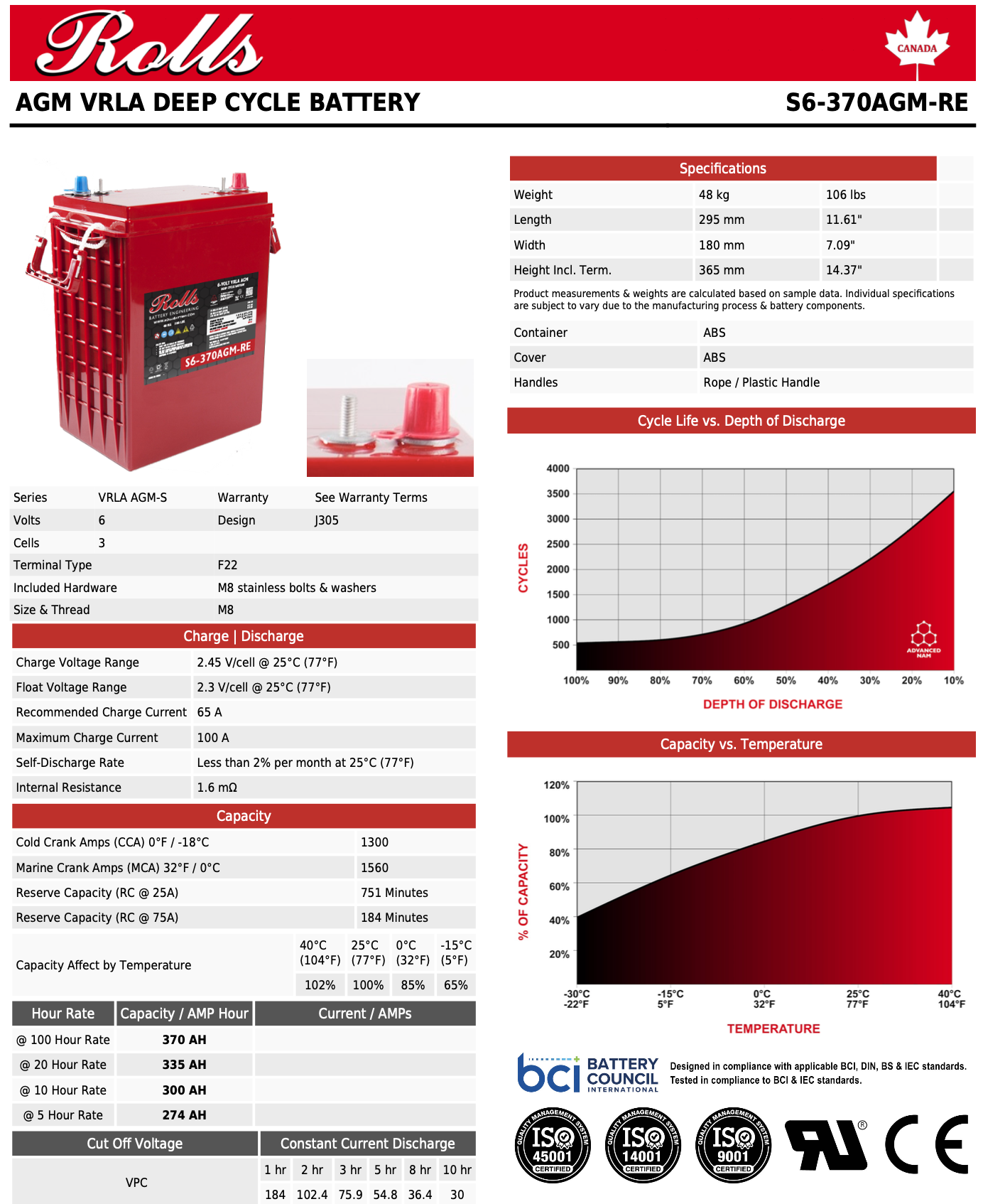Batería AGM Rolls S6-370AGM 370Ah 6V (C100). Las baterías Rolls premium de ciclo profundo se han forjado una reputación de fiabilidad y confianza en el exigente mercado de las energías renovables.