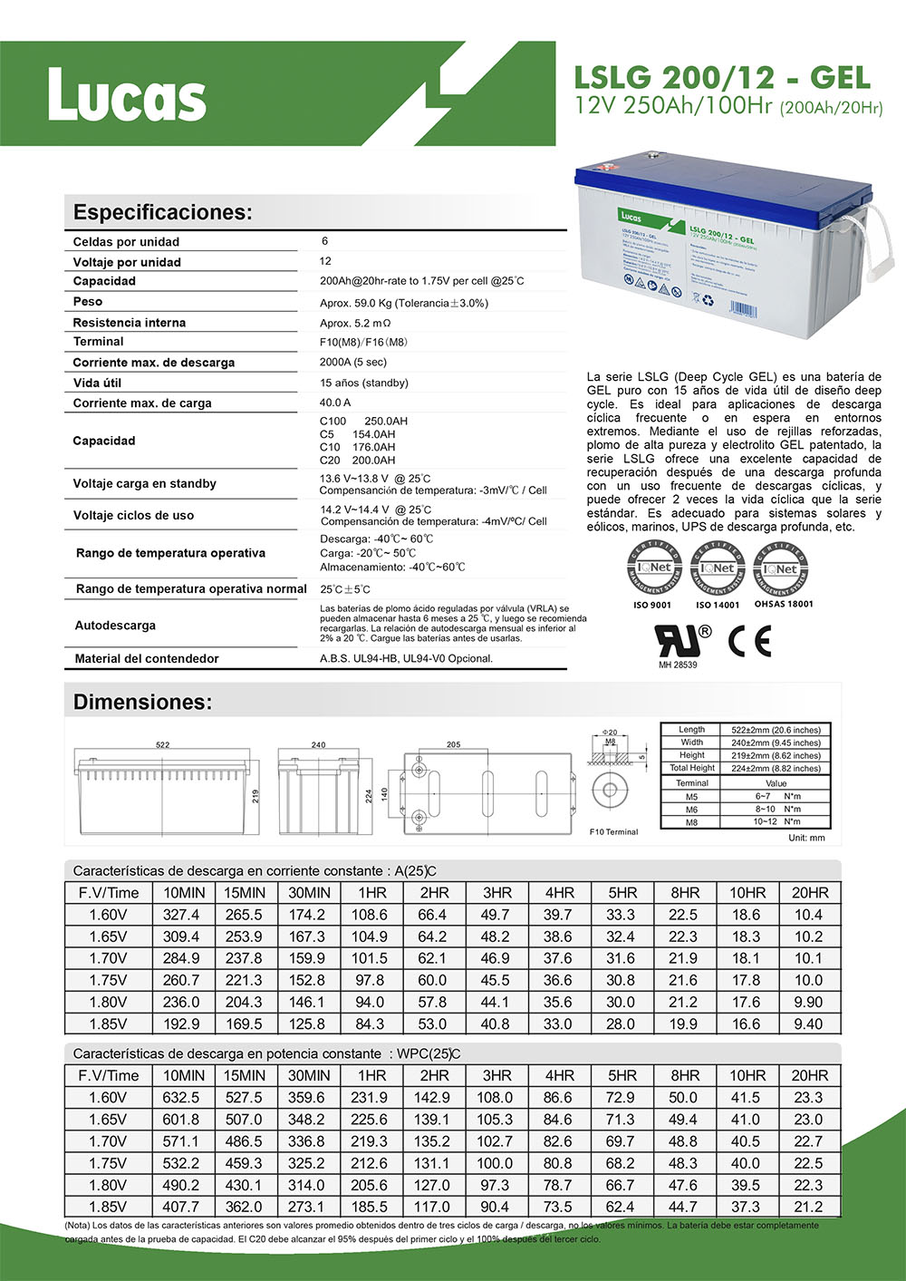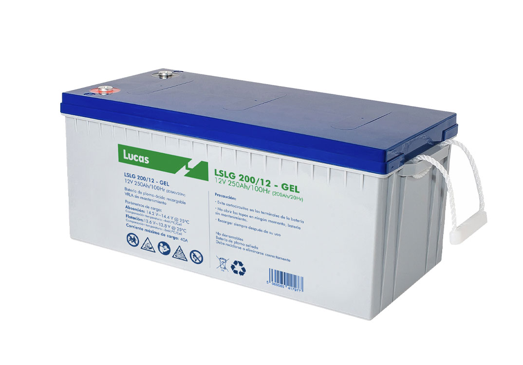 Batería de Gel Lucas LSLG 200/12 12V 250Ah en C100. La serie LSLG (Deep Cycle GEL) de Lucas Batteries es una batería de GEL puro con 15 años de vida útil de diseño deep cycle.