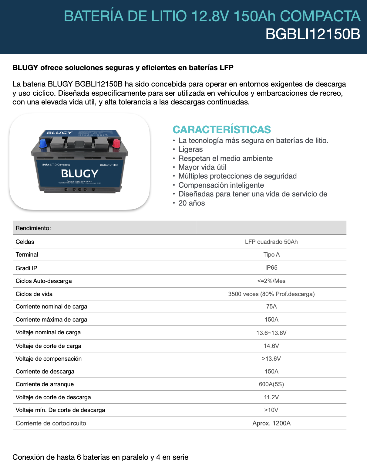 La batería BLUGY BGBLI12150B ha sido concebida para operar en entornos exigentes de descarga y uso cíclico. Diseñada específicamente para ser utilizada en vehículos y embarcaciones de recreo, con una elevada vida útil, y alta tolerancia a las descargas continuadas.