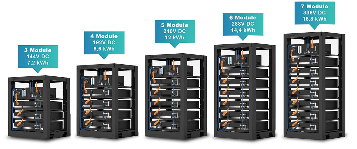 Batería de Litio Pylontech H48050 Alto Voltaje 48V 2,4kW. En un sistema de alto voltaje de Pylontech, por los requerimientos de tensión del controlador es necesario conectar un mínimo de 3 unidades y un máximo de 7. Por ello la capacidad mínima en un sistema formado por baterías de litio Pylontech de alto voltaje es de 7,2kWh nominales. En el extremo opuesto, a un mismo BMS SC0500 podremos conectar un máximo de 7 unidades de la Batería de Litio Pylontech H48050 48V HV, lo que se traduce en 16,8kWh.