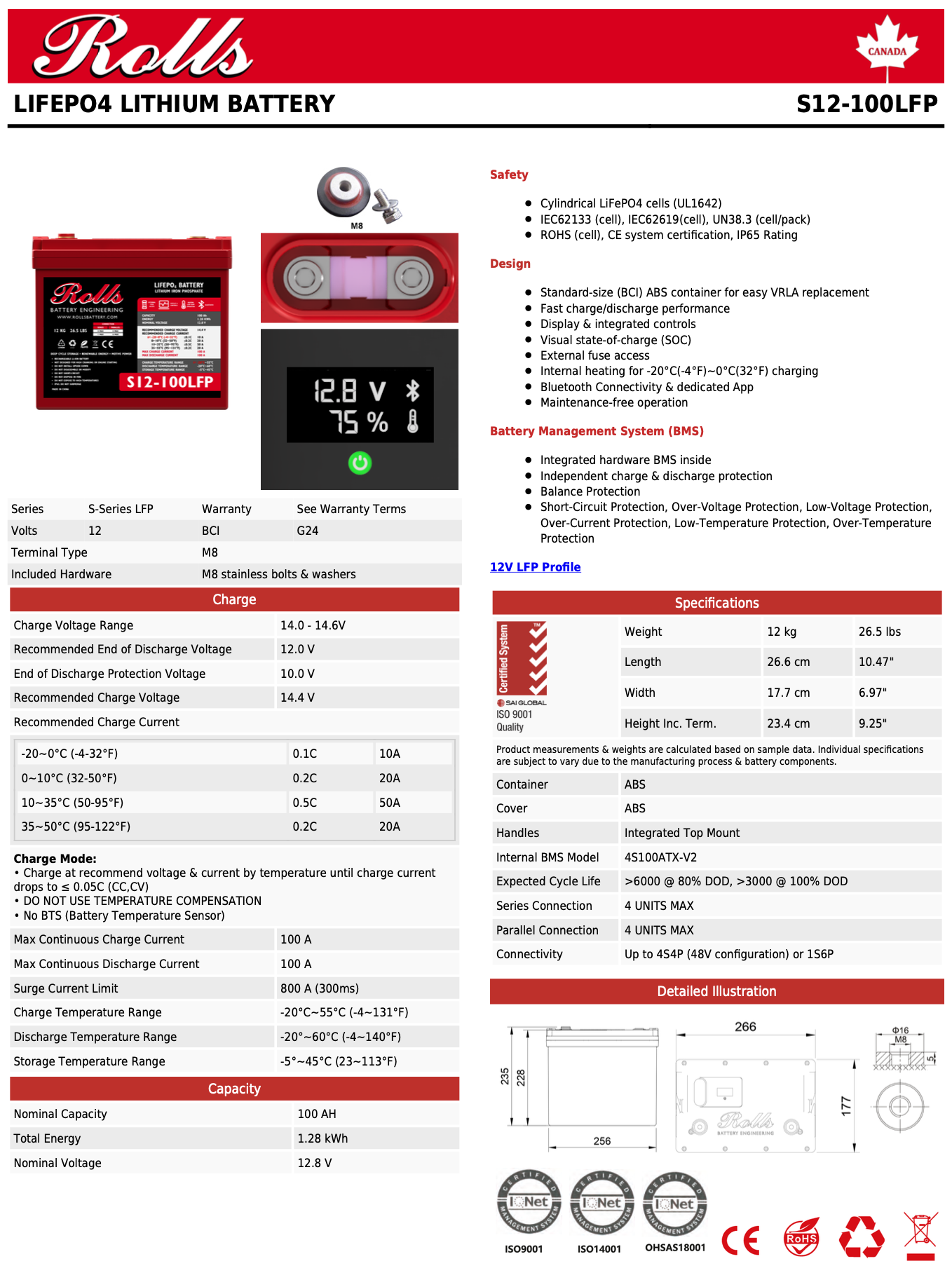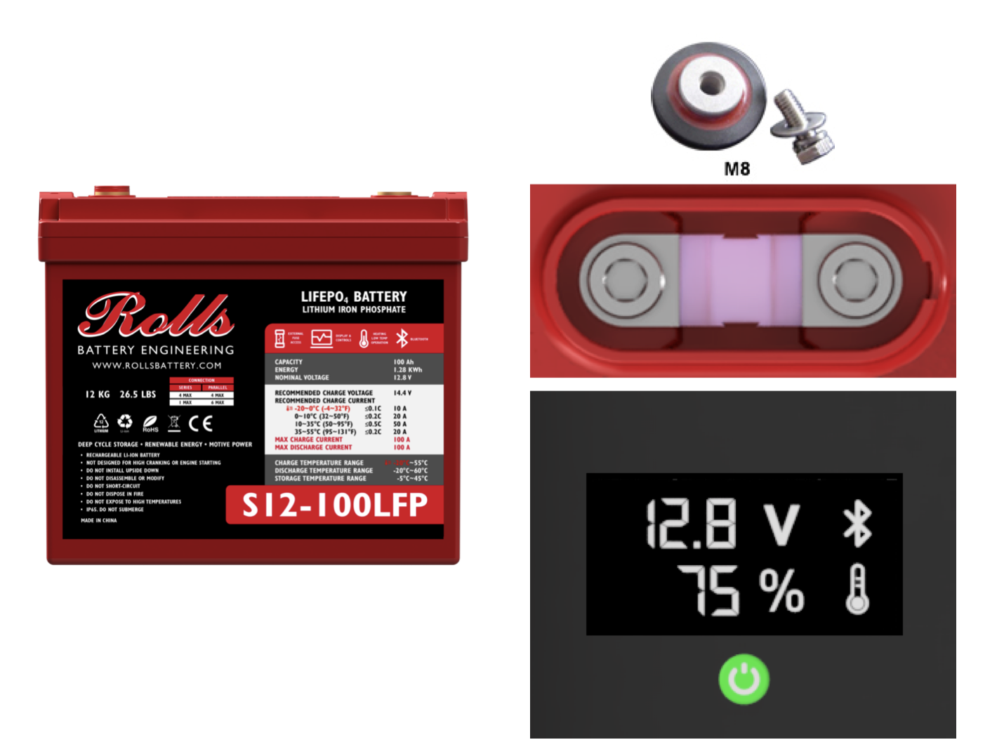 Las baterías Rolls R-Series y S-Series de fosfato de hierro y litio (LFP/LiFePO4) son un reemplazo ideal para las baterías tradicionales de plomo-ácido de tamaño y capacidad equivalentes y ofrecen la misma calidad, confiabilidad y rendimiento que se encuentran en otros productos Rolls Battery. Se pueden conectar hasta 4 baterías en serie y hasta 4 baterías en paralelo.