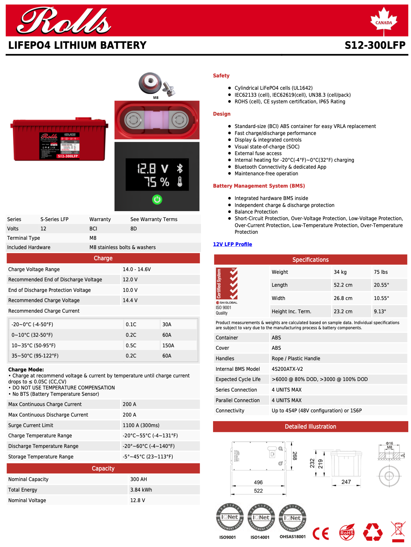 Las baterías Rolls R-Series y S-Series de fosfato de hierro y litio (LFP/LiFePO4) son un reemplazo ideal para las baterías tradicionales de plomo-ácido de tamaño y capacidad equivalentes y ofrecen la misma calidad, confiabilidad y rendimiento que se encuentran en otros productos Rolls Battery. Se pueden conectar hasta 4 baterías en serie y hasta 4 baterías en paralelo.