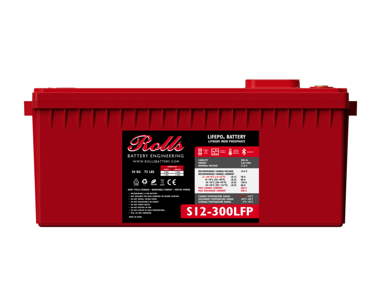 Batería de Litio Rolls S12-300LFP 12V 300Ah 3.84 kWh. Se pueden conectar hasta 4 baterías en serie, o hasta 4 baterías en paralelo.