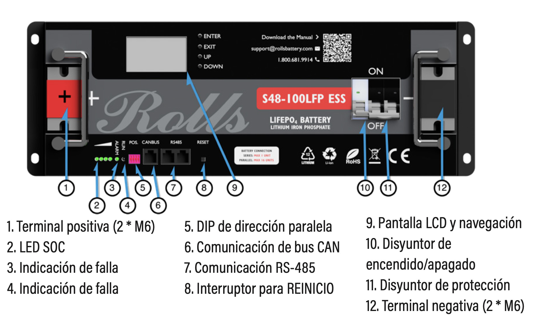Batería LIFEPO4 LITHIUM BATTERY del fabricante Canadiense Rolls Batteries. Las baterías Rolls S-Series de fosfato de hierro y litio (LFP/LiFePO4) de 48 voltios están diseñadas para su uso en sistemas de mayor escala, de 48 V (51,2 V nominales), para sistemas de respaldo conectados a la red y fuera de la red. Las baterías Rolls S-Series 48V LFP ESS están diseñadas para escalar en capacidad en paralelo, con comunicación entre baterías y equipos conectados externamente.