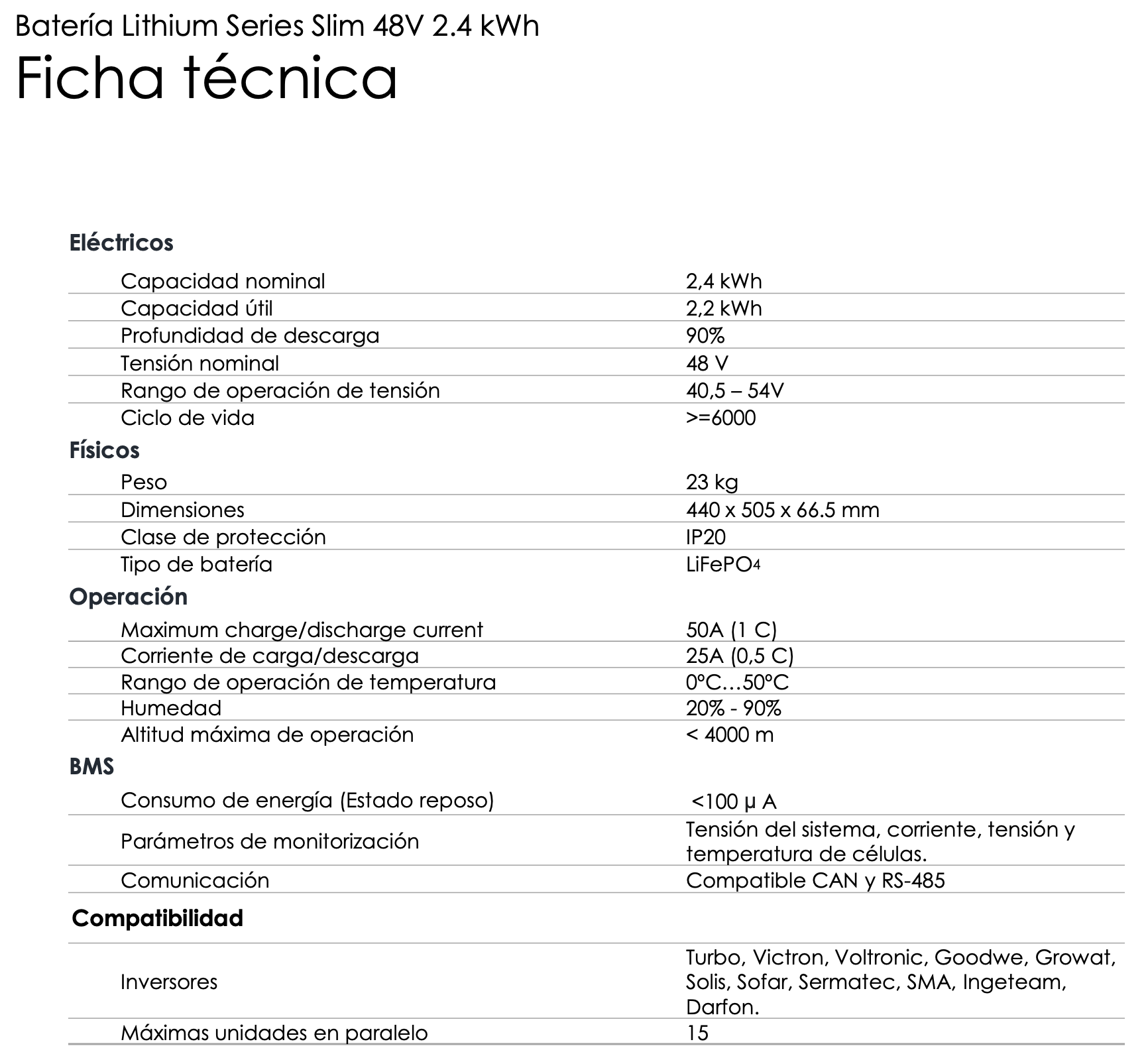 Batería de Litio Ferro Fosfato (LiFePO4) de 2,4kWh de capacidad y 48V para instalaciones de autoconsumo y aislada. Conexión en paralelo de hasta 15 baterías con comunicación. Esta batería destaca por ser 33% más estrecha; 15% más ligera y tiene la misma capacidad.