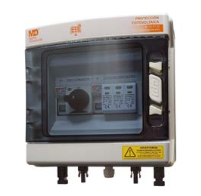 Caja de Protecciones de Corriente Continua para 1 String de placas solares, con seccionador y fusibles.
