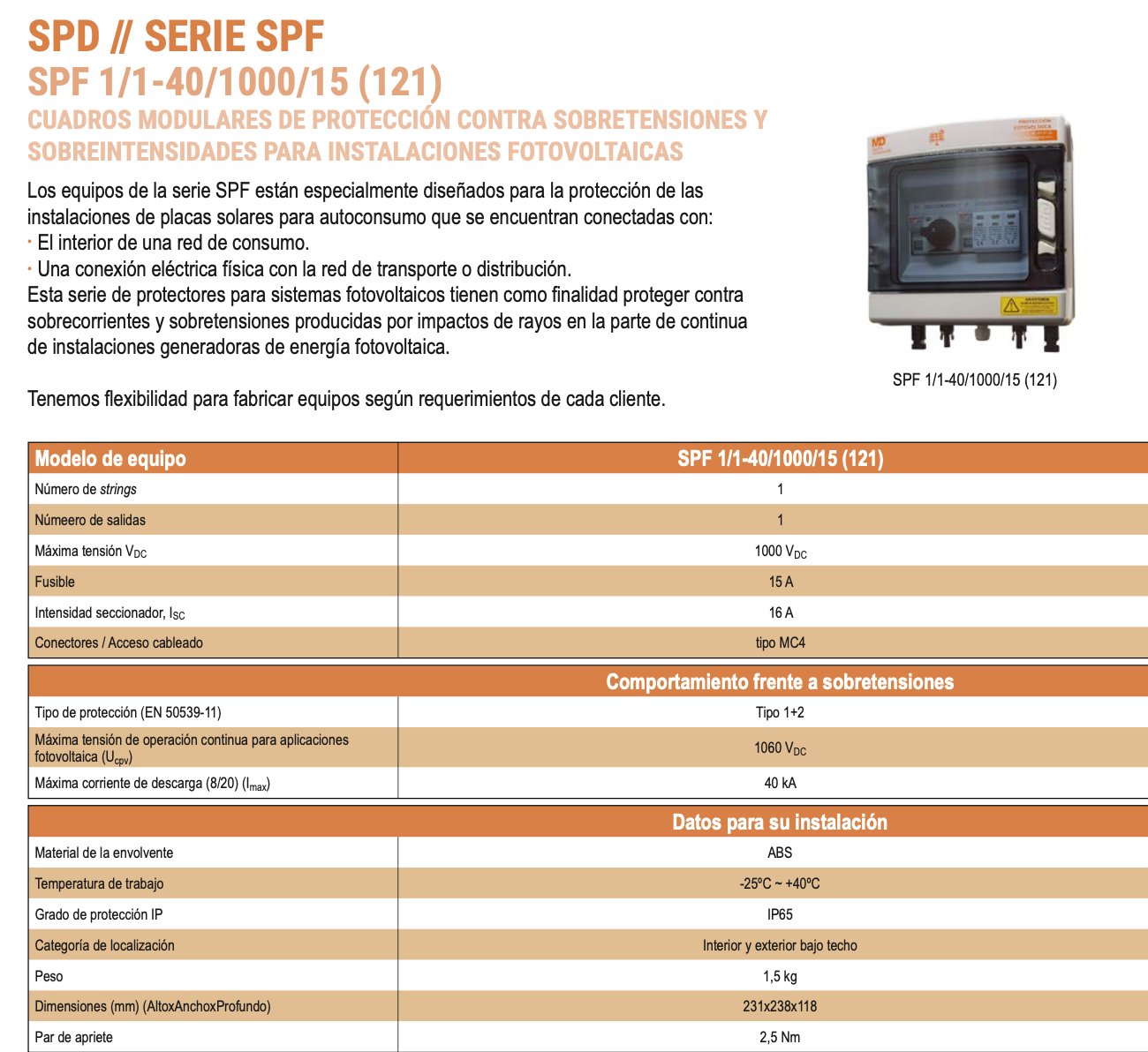 Los cuadros de protección SPF son una solución compacta y sencilla de instalar para la protección de las instalaciones de autoconsumo solar. Debido a la ubicación de este tipo de instalaciones, el conjunto de paneles fotovoltaicos están expuestos a los efectos de las descargas atmosféricas, tanto por impacto directo, como a través de inducciones o embudos de potencial, causando sobrecorrientes y sobretensiones en la instalación.
