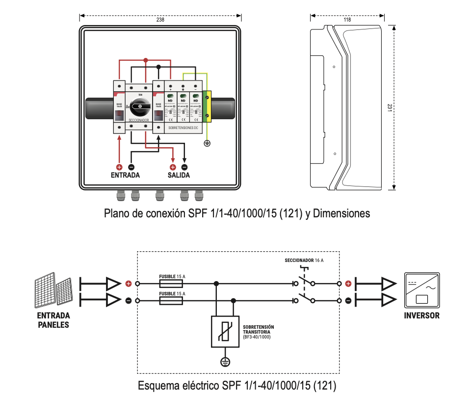 Caja de Protecciones de Corriente Continua para 1 String de placas solares con Seccionador y Fusibles.
