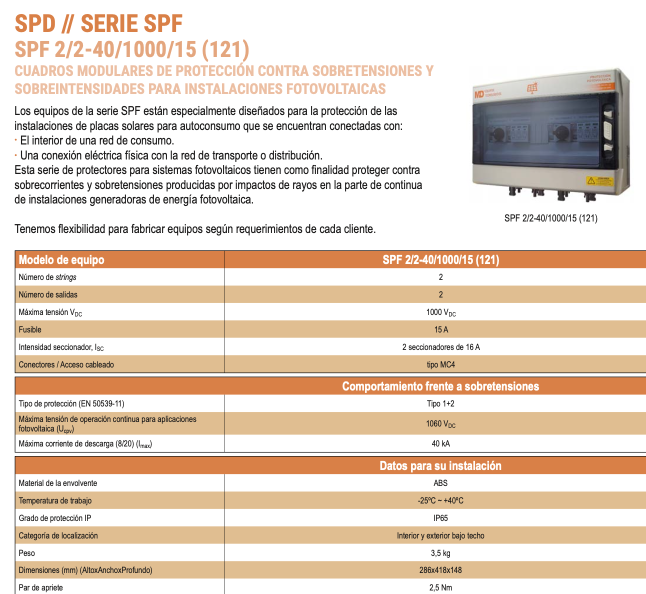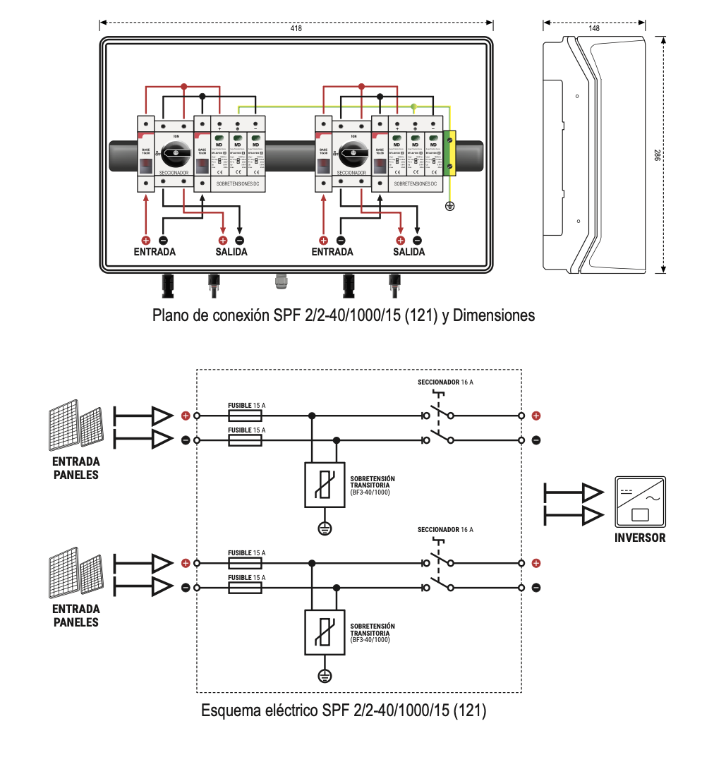 Los equipos de la serie SPF están especialmente diseñados para la protección de las instalaciones de placas solares para autoconsumo que se encuentran conectadas con: