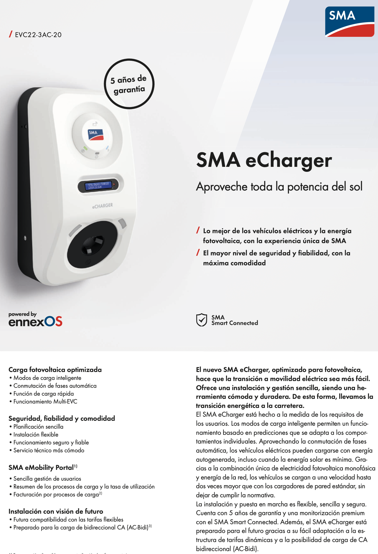 Cargador de coche eléctrico SMA eCharger 22kW trifásico con toma de carga