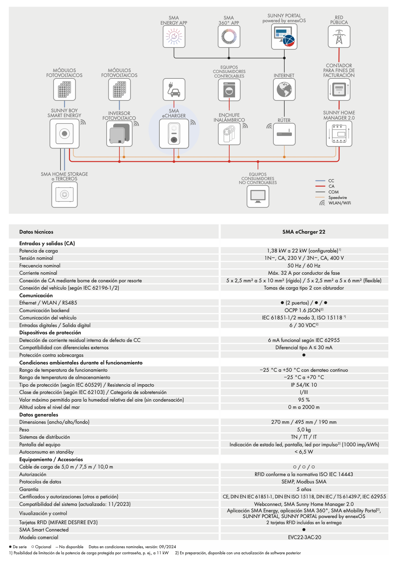 Cargador SMA eCharger 22kW con toma de carga. Cargador trifásico de CA para la carga rápida y optimizada de vehículos en combinación con el Sunny Home Manager 2.0. Configuración de la potencia de carga de 1,38 a 22 kW, toma de carga de tipo 2, protección contra apagón, función boost, conmutación de fase automática, protección de corriente diferencial integrada de 6 mA CC, lector de tarjetas RFID incl. 2 tarjetas SMA RFID, pantalla LCD.