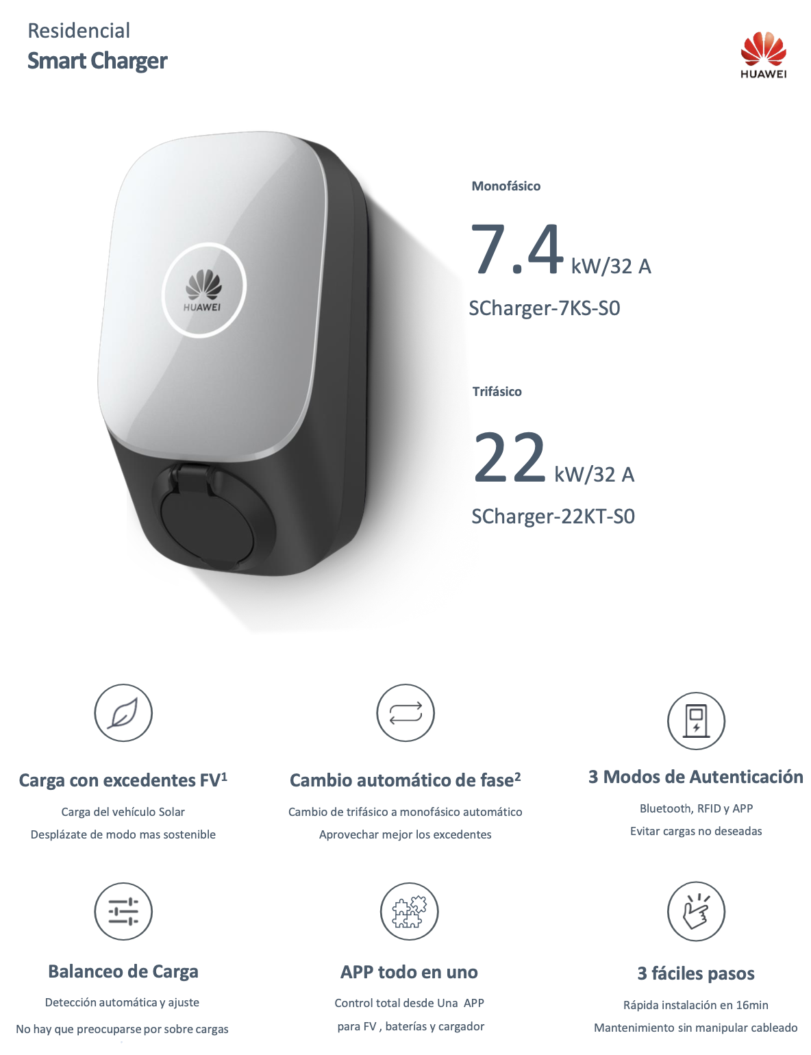 Cargador de Vehículo eléctrico Huawei 7.4KW /32A. 1-phase. Carga con o sin FV. Tipos de redes admitidas: TN, TT, IT. Conector tipo 2 (sin cable). Compatible con los inversores residenciales con Dongle WLAN/FE