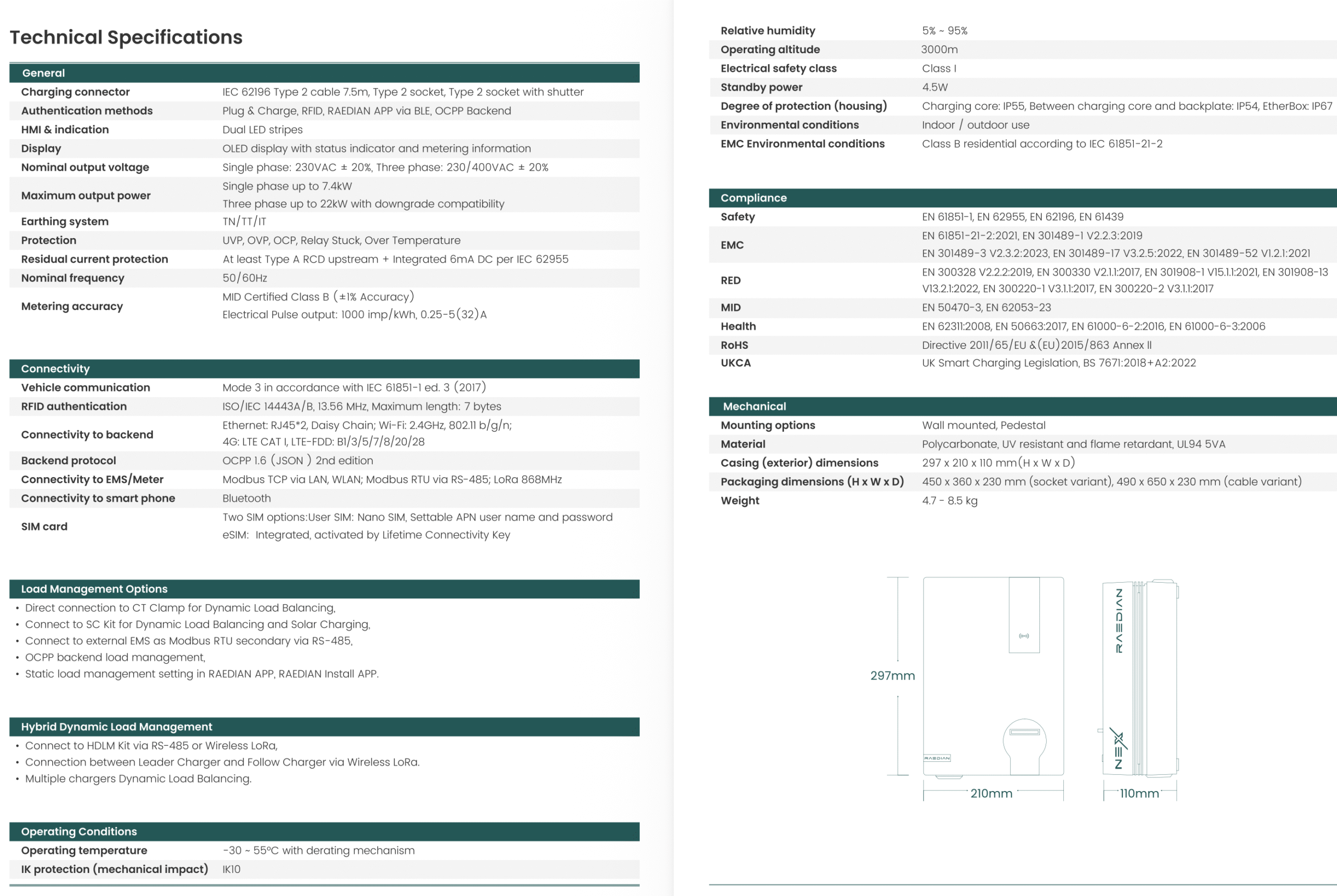 Cargador Raedian Nex trifásico 22kW con Socket Tipo2.