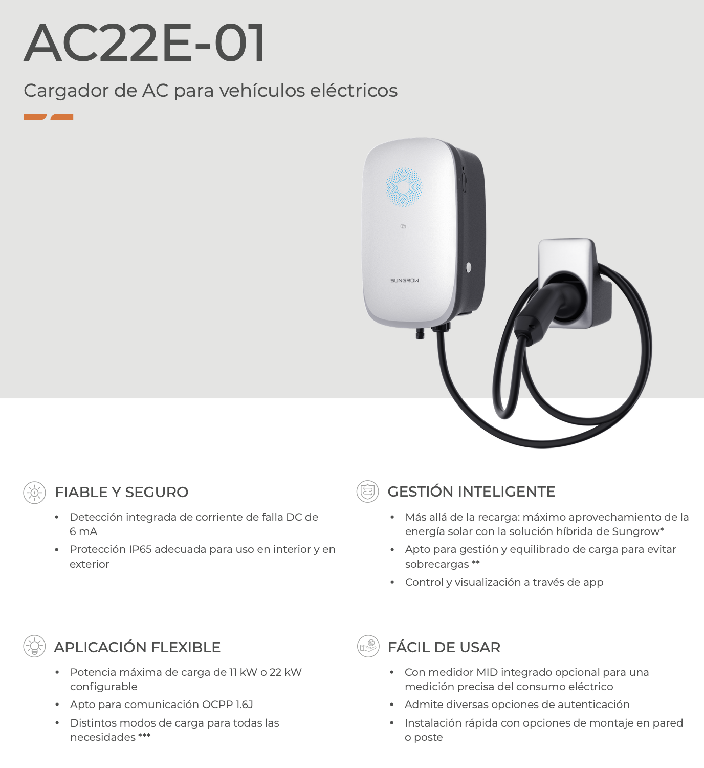 Cargador de vehículo eléctrico Sungrow AC22E-01 EV CHARGER Trifásico.