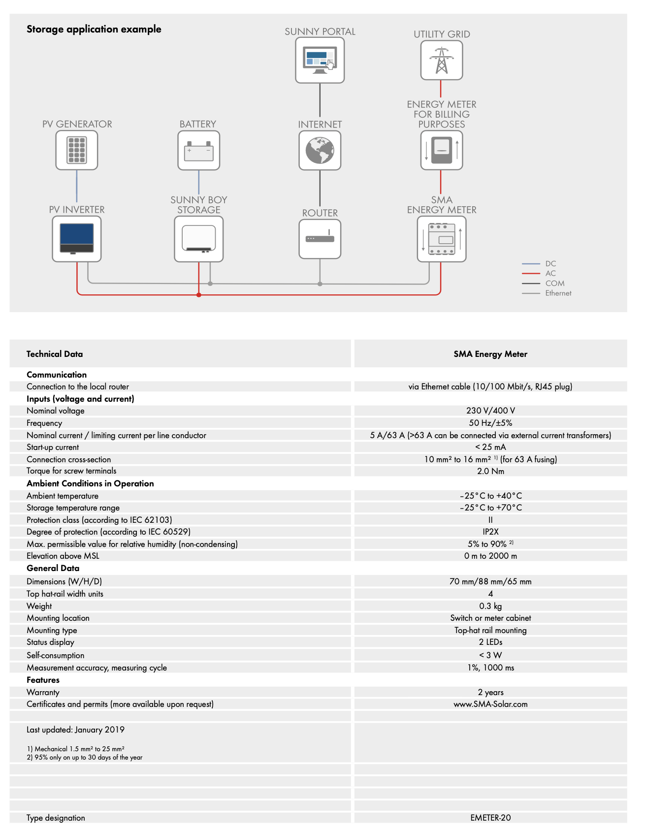 Contador inteligente bidireccional mono y trifásico, 50/60 Hz, para montaje en carril DIN de cuadro. Funcionamiento como contador independiente o para el monitoreo y control de inversores SMA solares y de baterías. Interfaz Ethernet Speedwire para inversores SMA, soporta hasta 4 inversores o 30 kW. Medida directa de hasta 63 A, para mayores corrientes se requiere del uso de toroidales externos.