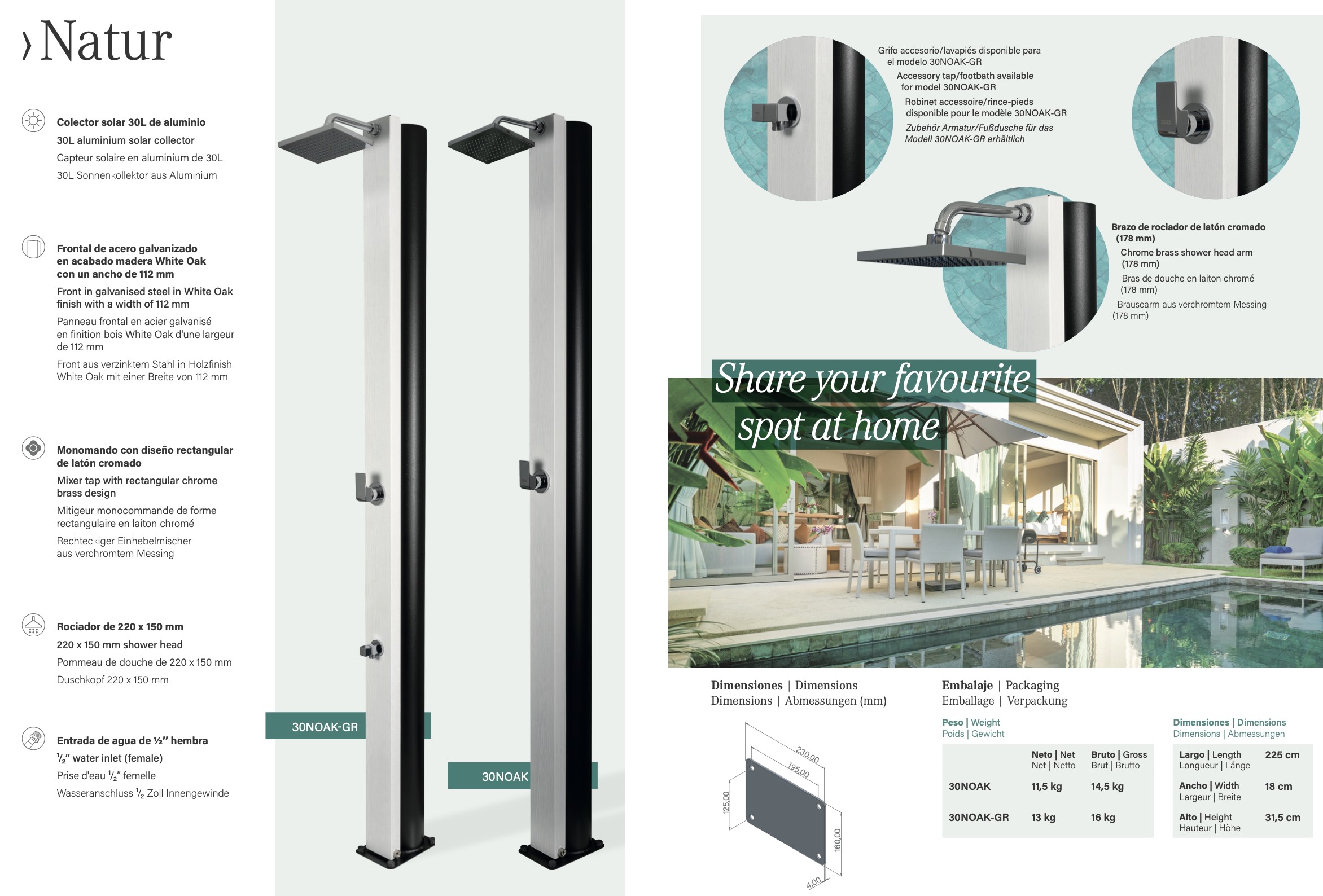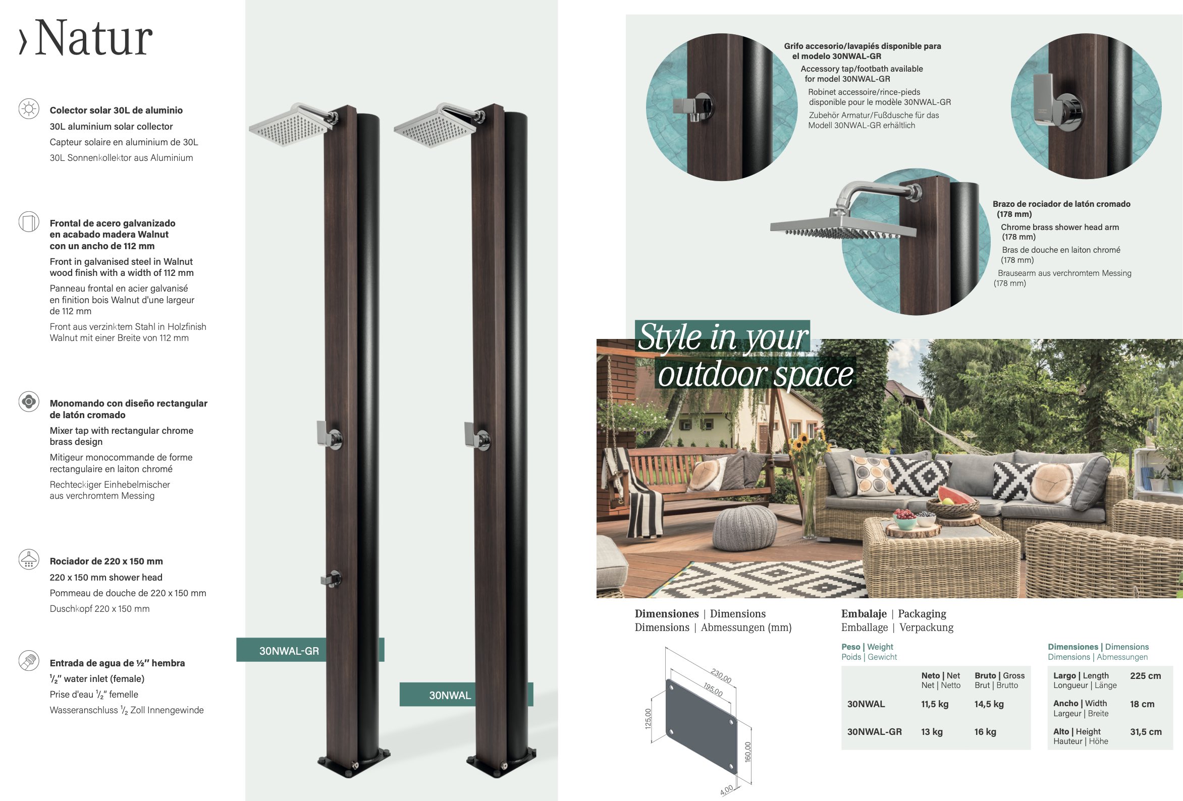 Es una ducha que se centra en la funcionalidad de los espacios para lograr estar conectada a la naturaleza, y se adapta de forma extraordinaria a las diferentes épocas y estilos arquitectónicos. Esto permite identificar el producto como un complemento para el jardín o cualquier otro espacio exterior que sobrevive a las tendencias.