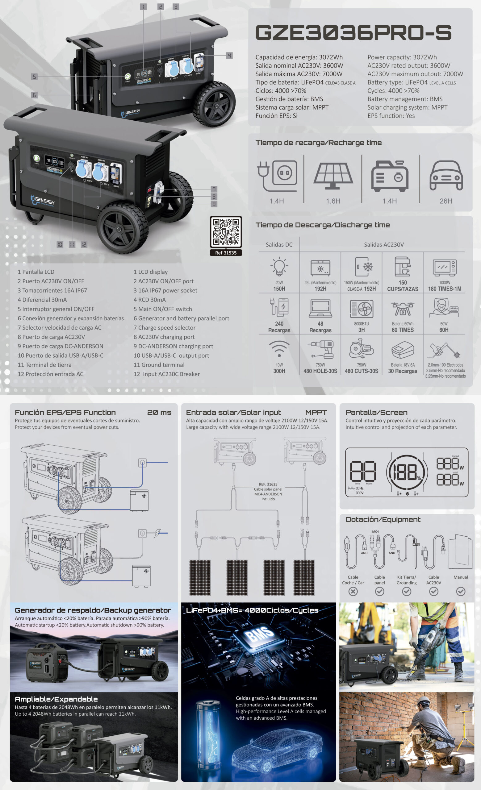 Estación de Energía Profesional Genergy GZE-3036PRO-S 3600W con Batería de Litio 3072Wh