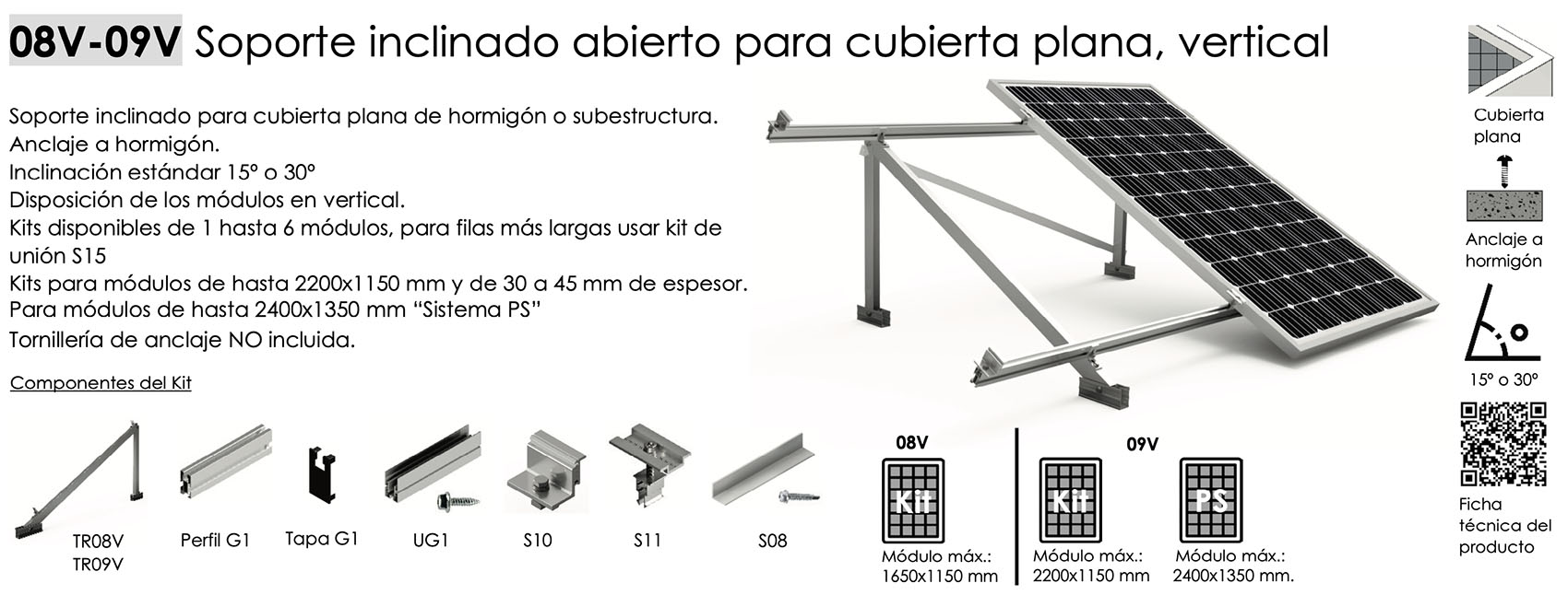 La estructura 08V tiene una capacidad de 1 a 6 módulos fotovoltaicos dispuestos en vertical, y está diseñada para ser instalada sobre cubiertas de hormigón o suelo mediante contrapesos o zapatas. Además de una fácil instalación la estructura 08V es modular, es decir, puede ampliarse en cualquier momento dependiendo de las necesidades.
