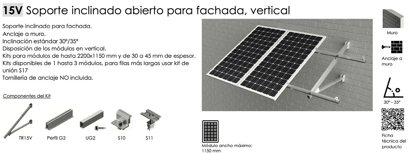 La estructura 15V tiene una capacidad de 1 a 3 módulos fotovoltaicos dispuestos en vertical, y está diseñada para ser instalada sobre paredes o muros. La inclinación estándar son 30º 35º