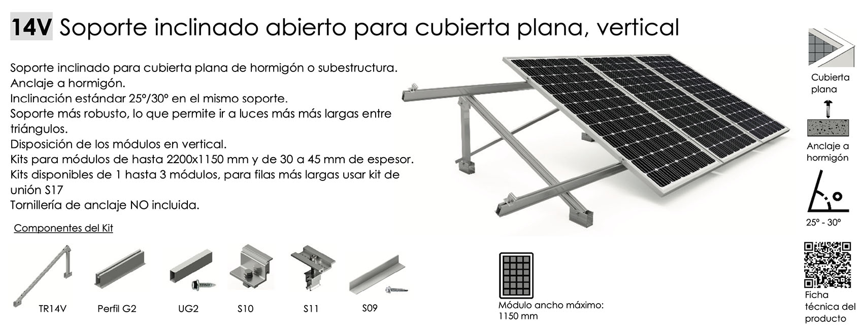 La estructura 14V tiene una capacidad de 1 a 3 módulos fotovoltaicos dispuestos en vertical, y está diseñada para ser instalada sobre cubiertas de hormigón o suelo mediante contrapesos o zapatas. El kit estándar permite una inclinación regulable desde 25º a 30º.