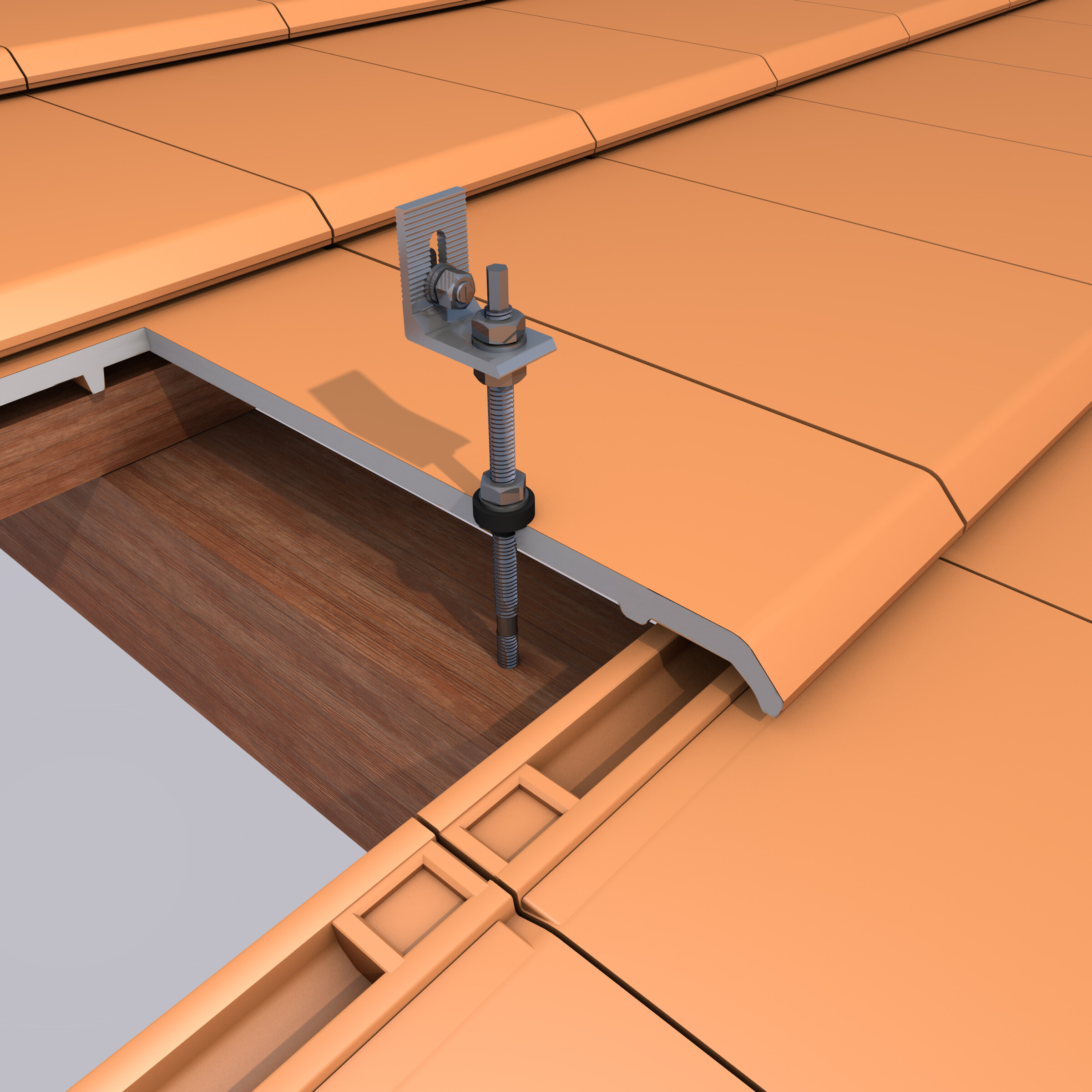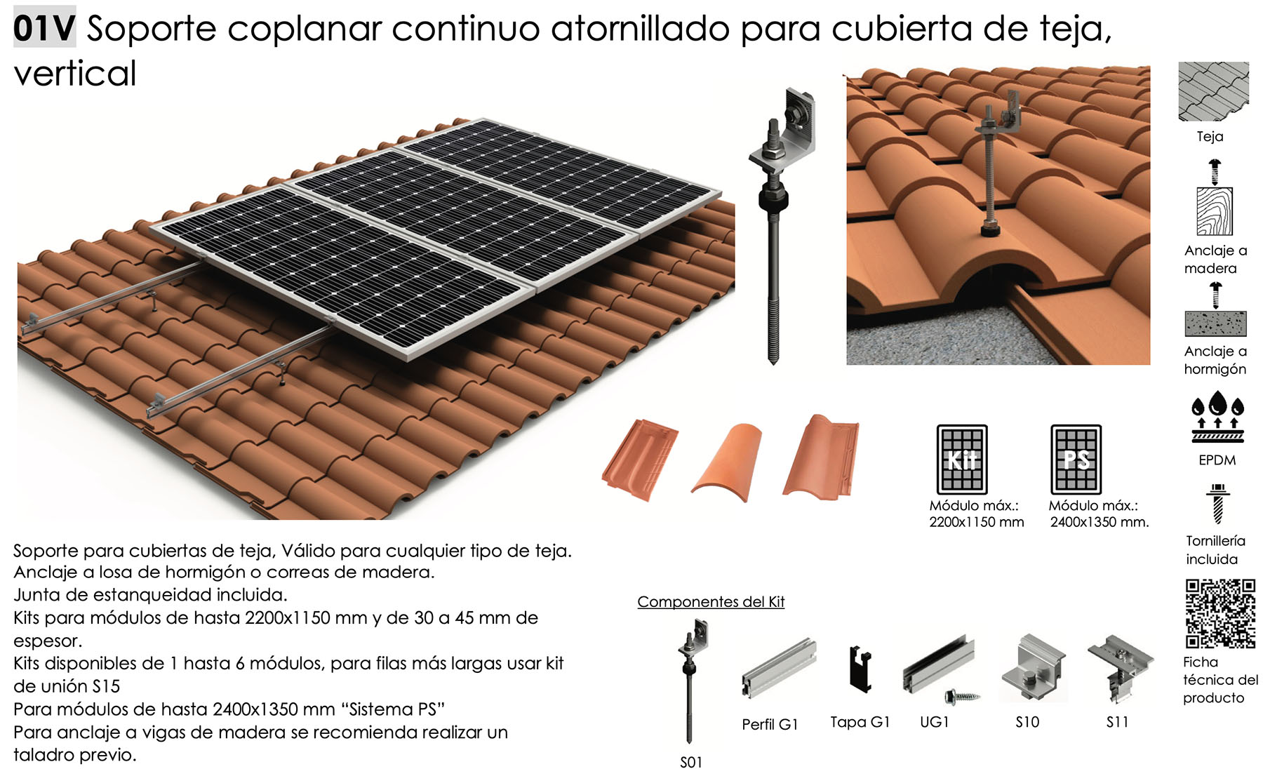 La estructura 01V tiene una capacidad de 1 a 6 módulos fotovoltaicos dispuestos en vertical y está diseñada para ser instalada sobre superficies de teja, con varilla roscada como fijación, adaptándose a la inclinación de la cubierta existente. Además de una fácil instalación ésta estructura es modular, es decir, puede ampliarse en cualquier momento dependiendo de las necesidades.