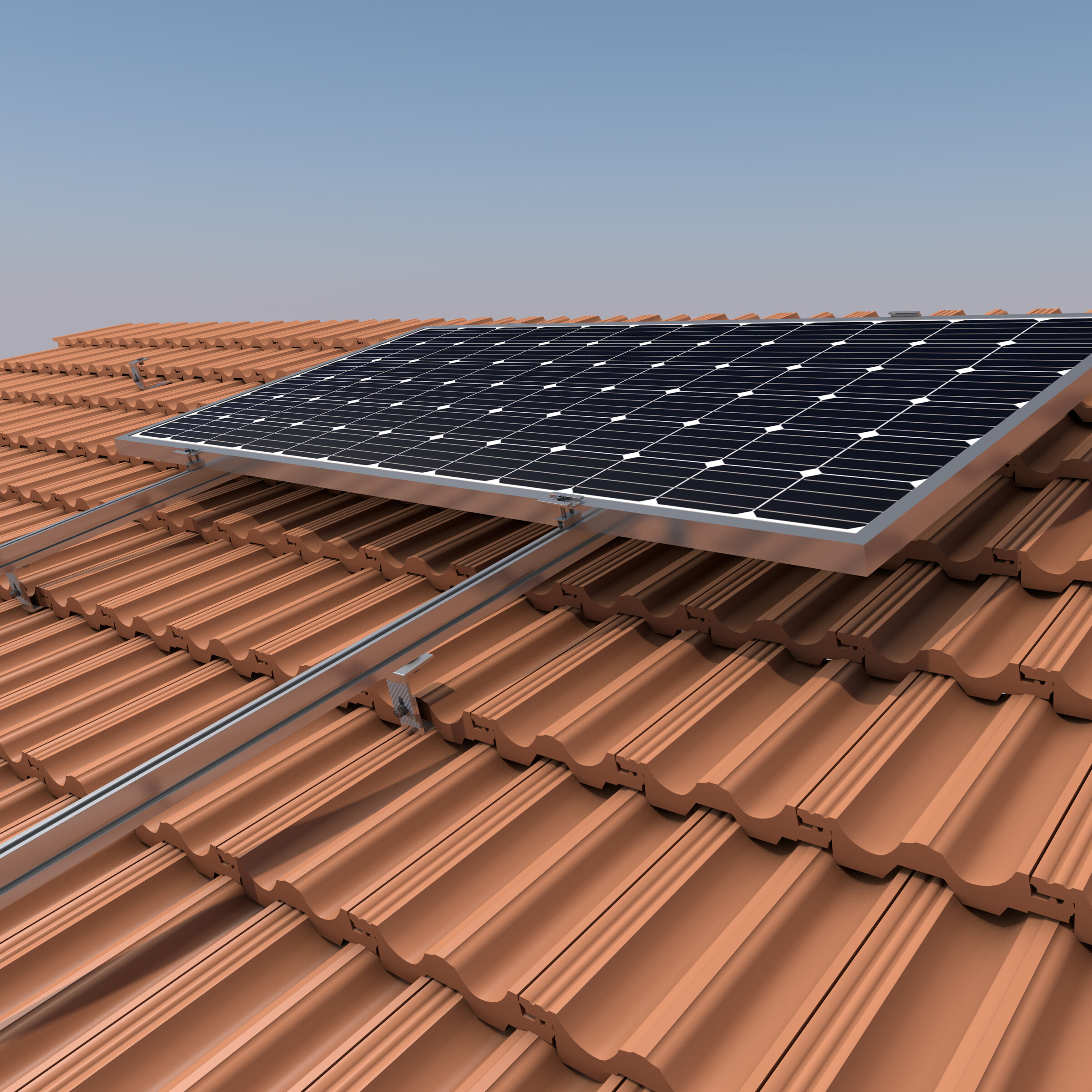 La estructura 02V tiene una capacidad de 1 a 6 módulos fotovoltaicos dispuestos en vertical y está diseñada para ser instalada sobre superficies de teja, adaptándose a la inclinación de la cubierta existente. Además de una fácil instalación ésta estructura es modular, es decir, puede ampliarse en cualquier momento dependiendo de las necesidades.