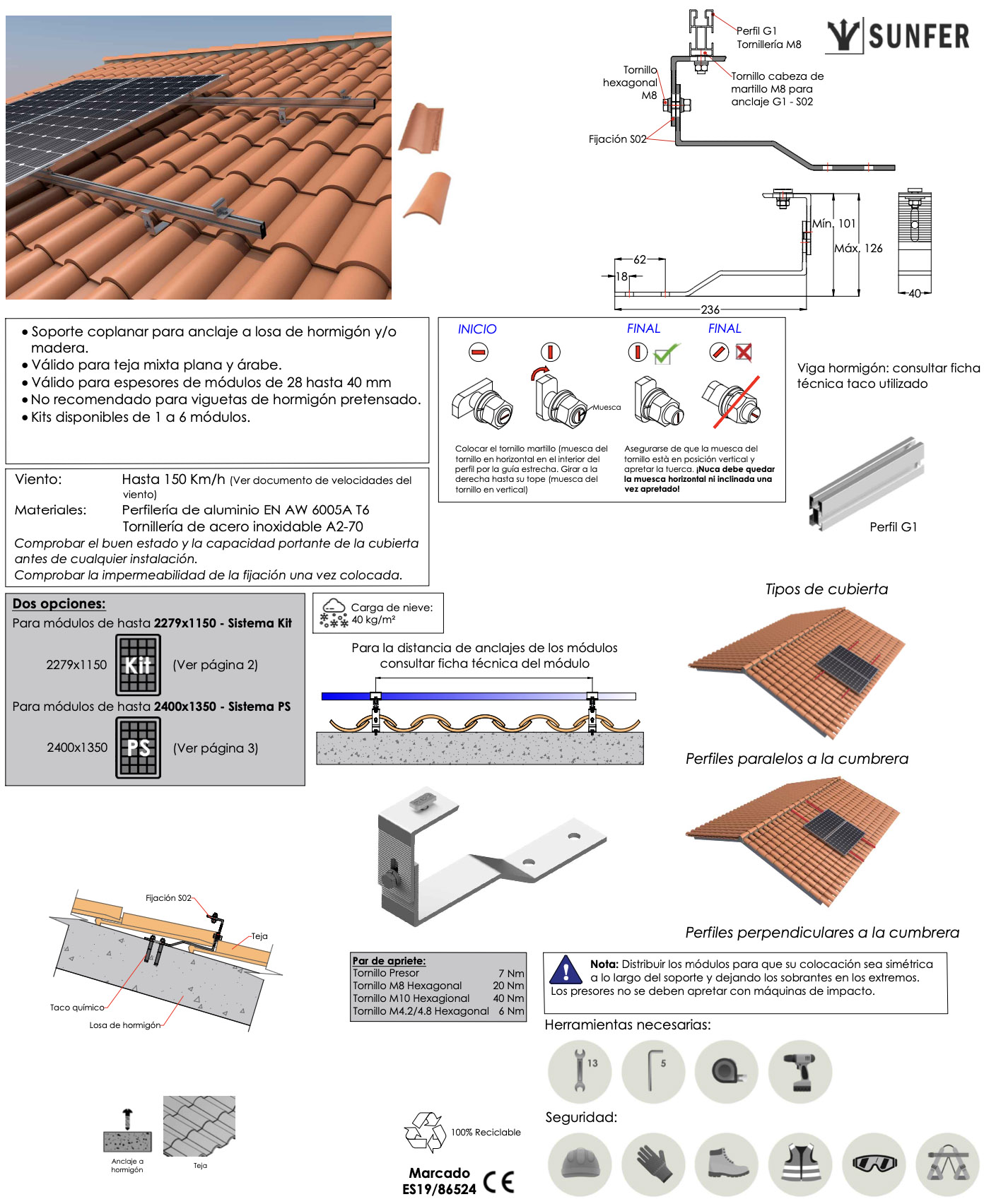 - Instalaciones recomendadas: Soporte integrado en cubiertas de teja