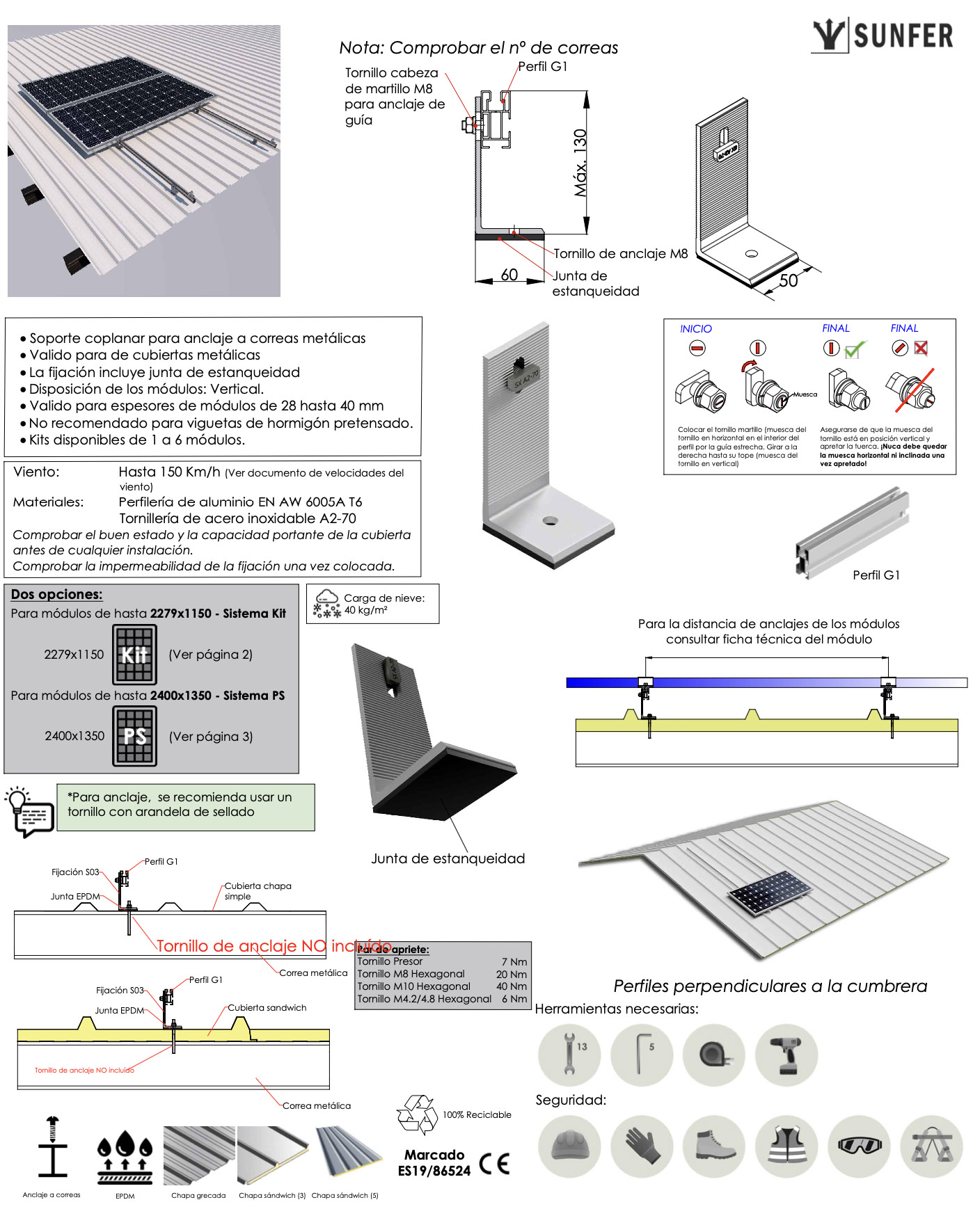 La estructura 03V tiene una capacidad de 1 a 6 módulos fotovoltaicos dispuestos en vertical y está diseñada para ser instalada sobre chapas metálicas, adaptándose a la inclinación de la cubierta existente (coplanar).