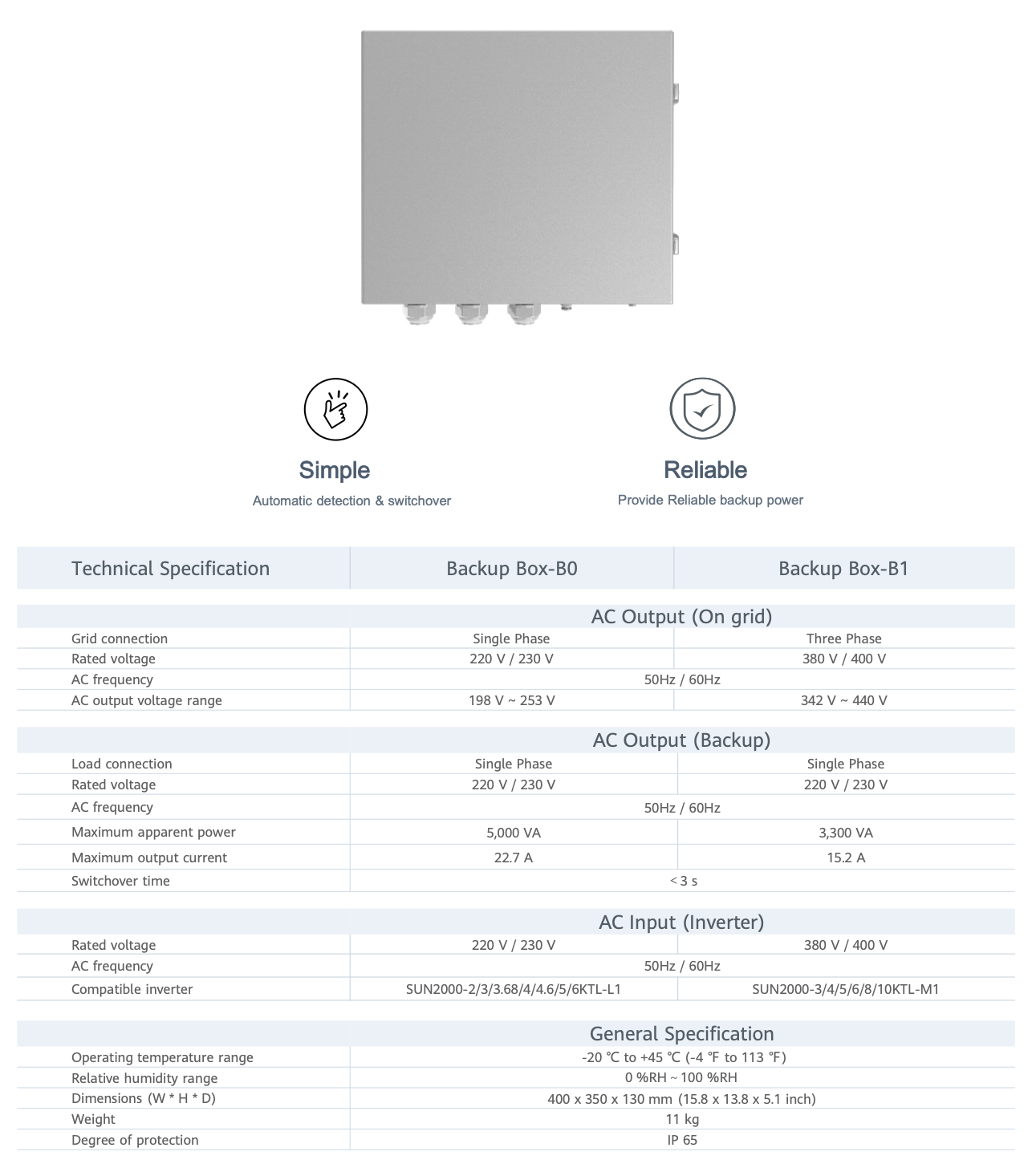 Backup box trifásica para Huawei 3-10KTL-M1 en combinación con soluciones de batería Huawei LUNA. Función “back-up” solo en una fase hasta 3 kW de potencia
