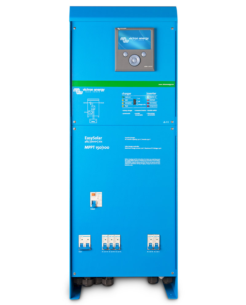 Inversor Cargador Victron Energy EasySolar 48/5000/70-100 MPPT150/100 Color Control. El EasySolar combina un controlador de carga solar MPPT, un inversor/cargador y un distribuidor CA en un solo dispositivo. El producto se instala fácilmente, con un mínimo de cableado.