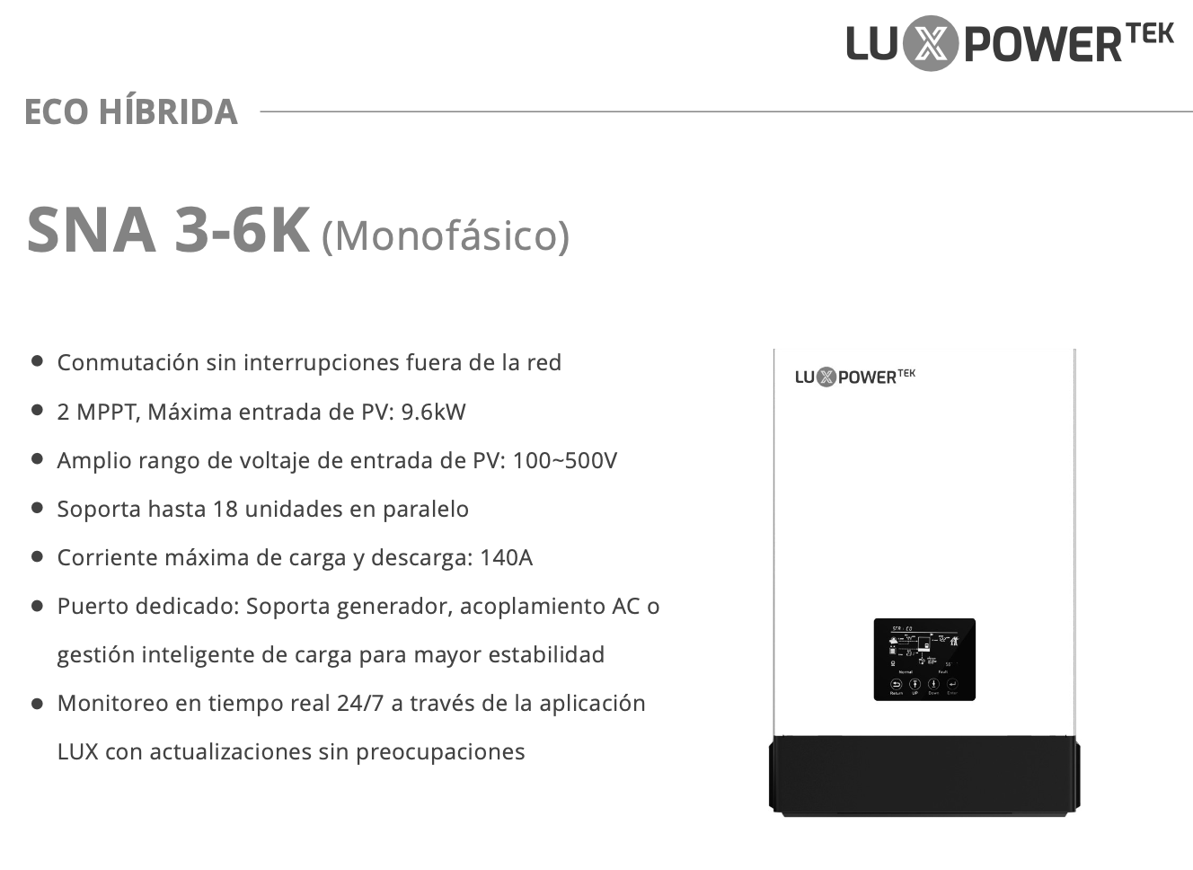 El inversor solar LuxPower SNA 5000W es un equipo todo en uno multifuncional que integra inversor, regulador solar MPPT y cargador de baterías en un solo dispositivo. Diseñado para ofrecer un suministro eléctrico estable y de alta calidad, es la opción ideal para viviendas, fincas o locales sin conexión a la red eléctrica o con redes inestables.