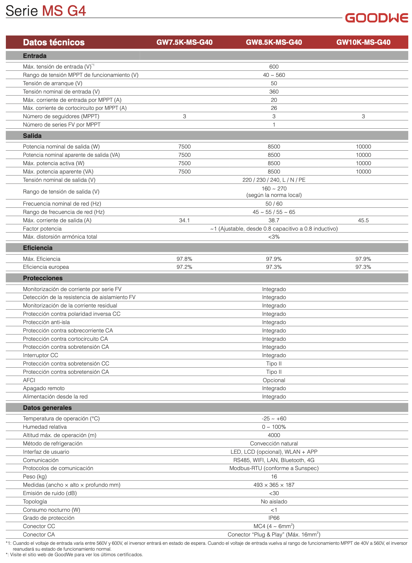Inversor GoodWe monofásico GW8.5K-MS-G4 | Potencia de salida 8,5KW | Incluye WIFI/LAN Kit-20 | Función AFCI integrada | Preparado para conexión en paralelo con DNS G4 a través de EzLink3000