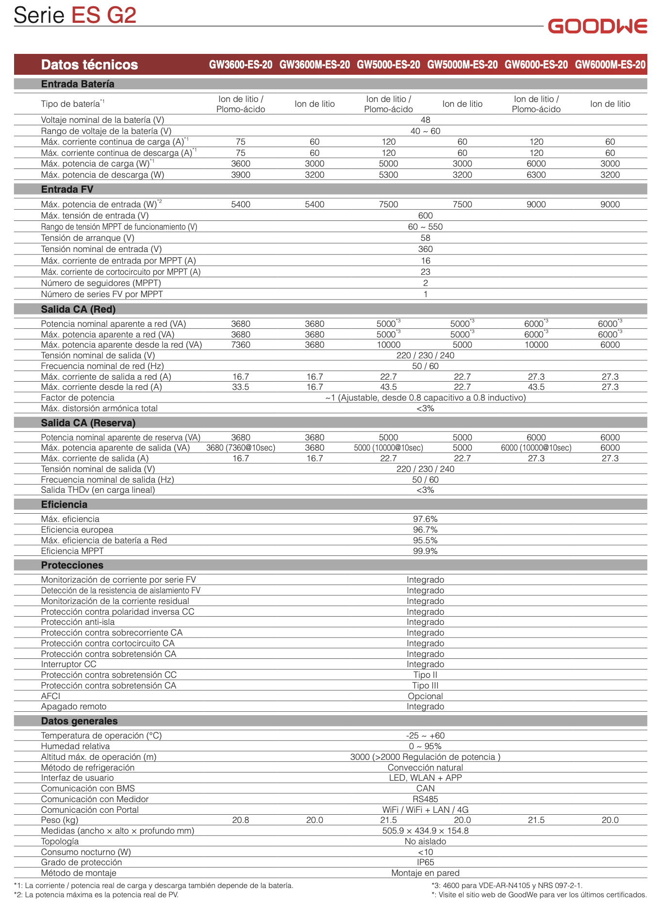 Inversor Híbrido monofásico GOODWE GW6000-ES-20 de 6kW. La serie ES G2 es compatible con una serie de baterías, incluida la batería GoodWe Lynx Home U, las baterías de litio de 48V de Pylontech o baterías de Plomo Ácido.
