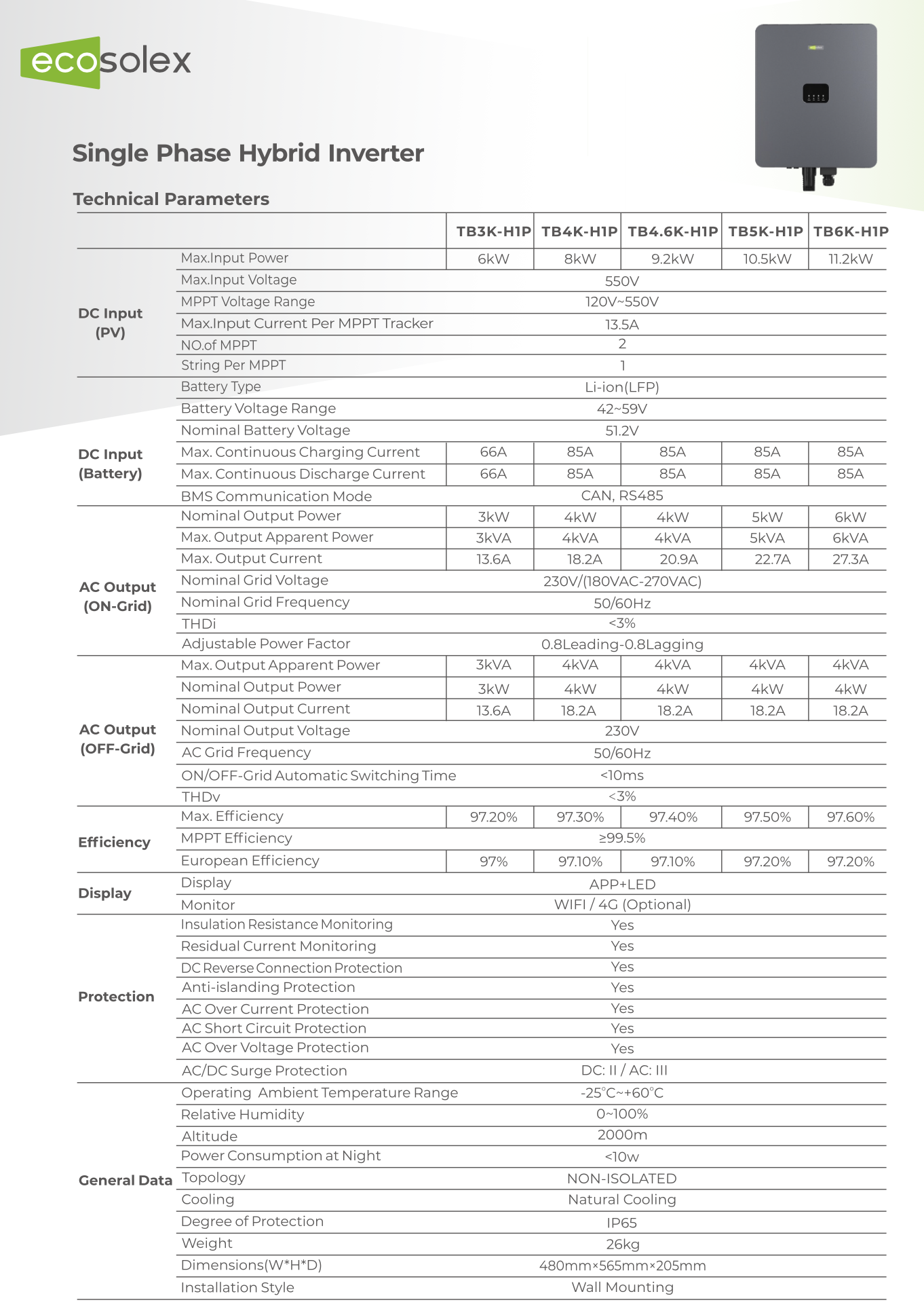 Inversor Híbrido Monofásico ECOSOLEX 6kW TB6K-H1P
