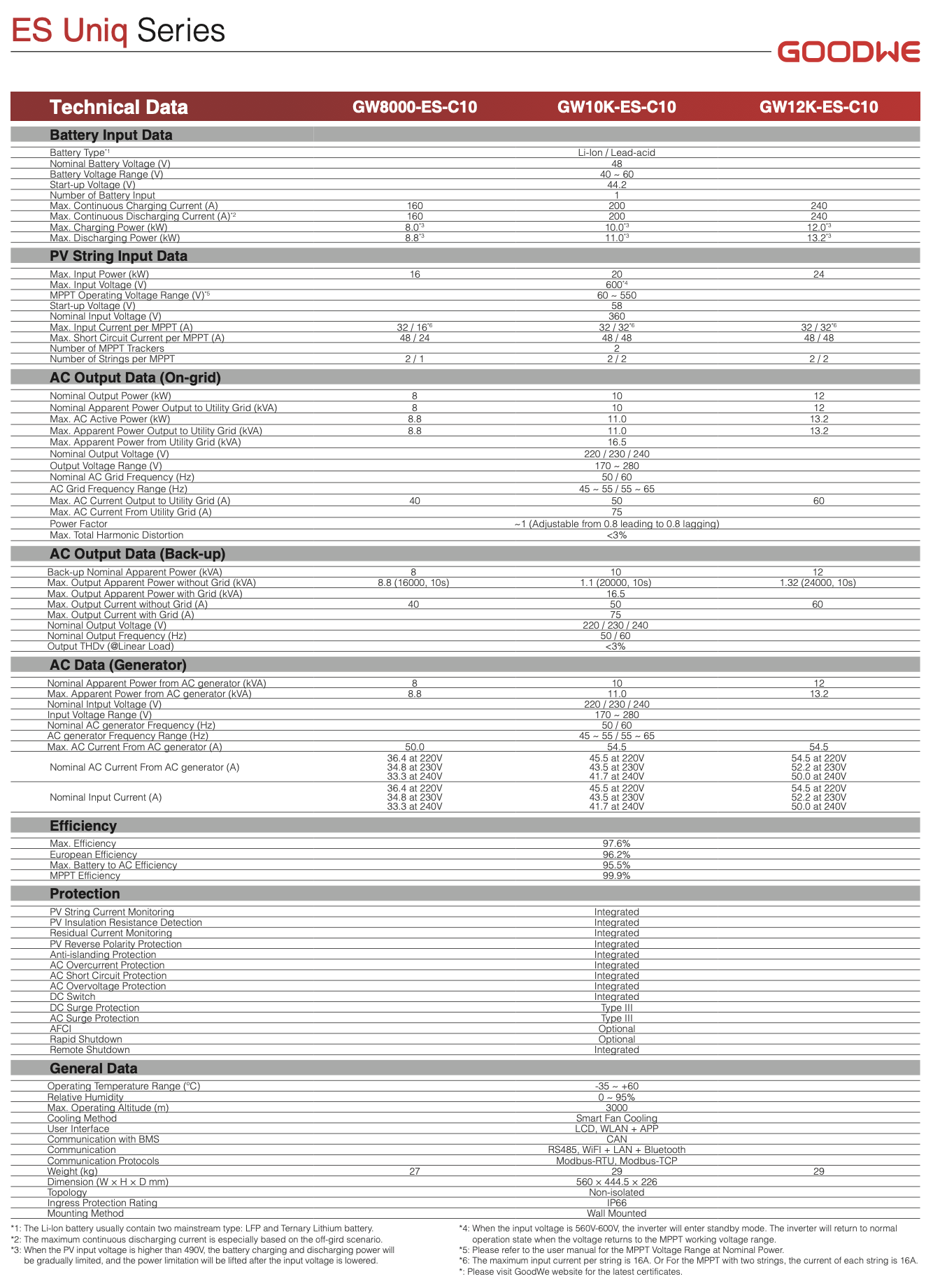 Inversor Híbrido Monofásico GOODWE ES UNIQ GW10000-ES-C10 10kW. Inversor híbrido monofásico GW10000-ES-C10 | Salida máxima de 11000 VA CA | Función de backup | Funciona en aislada | Compatible con baterías de litio de 48V y plomo ácido