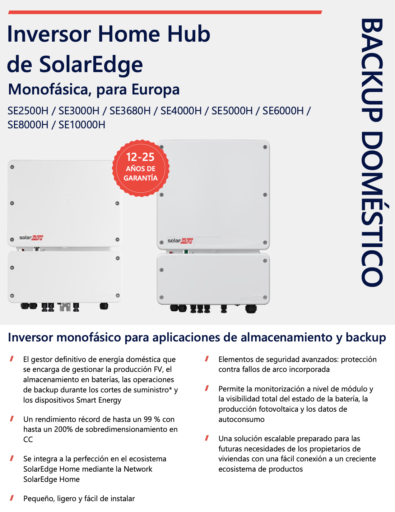 Inversor Monofásico SOLAREDGE Home Hub SE10000H 10kW. Compatible hasta con 3 baterías 400V SolarEdge Home. Admite Backup mediante el interface BI-EU1P. Protección integrada contra fallos de arco. Hasta un 200% de sobredimensionamiento de CC. Se integra con el ecosistema SolarEdge Home, a través de SolarEdge Home Network.
