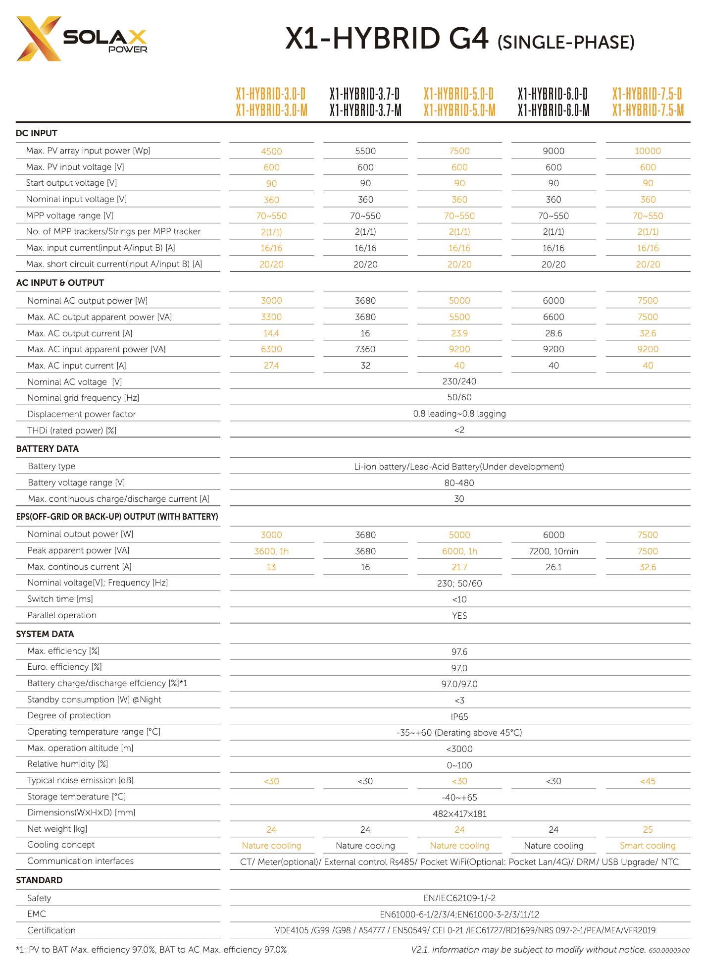 Solax Power X1-Hybrid-7.5-D G4 7500W 16A 2MPPT 70-550V (Incluye WiFi). Inversor híbrido monofásico de 7,5kW. Dispone de salida AC para cargas críticas (modo back up/EPS). Compatibles con las baterías SolaX modelos T58 y T30. Versión con interruptor DC.