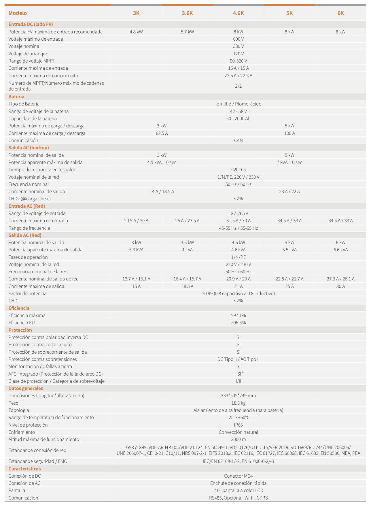 Inversor Híbrido Solis S5-EH1P6K-L 6kW. El inversor de almacenamiento de energía serie S5-EH1P(3-6)K-L está diseñado para sistemas residenciales de almacenamiento de energía fotovoltaica. La potencia de reserva de 5kW soporta cargas más críticas