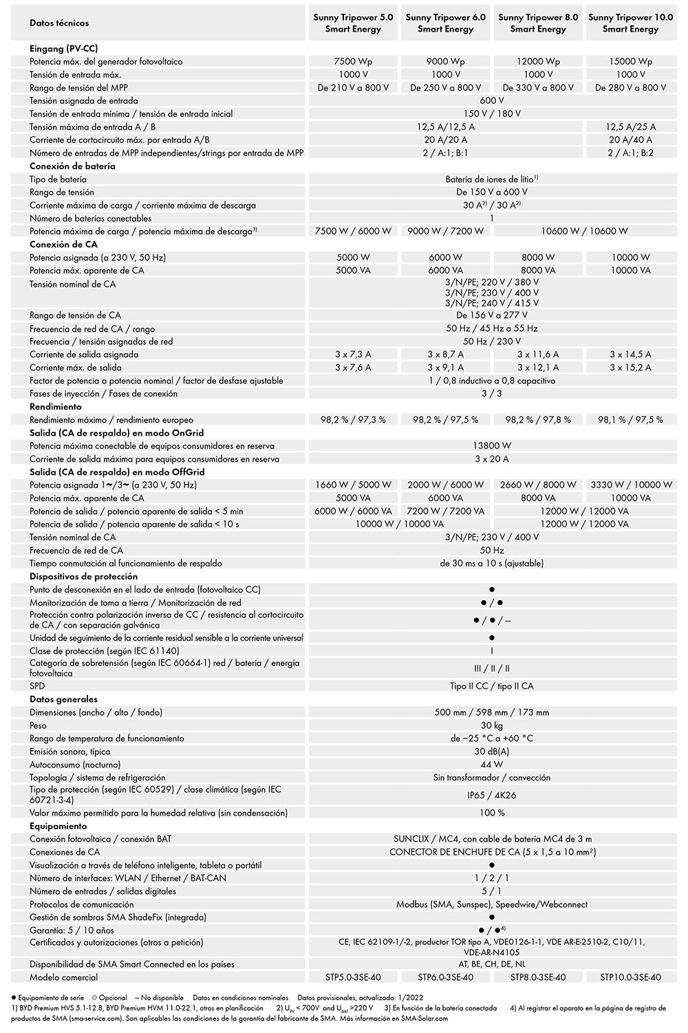 Inversor trifásico híbrido inteligente sin transformador para conexión a red. Servidor web integrado para la monitorización y el asistente de puesta en marcha. Pantalla informativa. Compatible con SMA 360º. Función Back-up automática integrada tanto para suministro mono- como trifásico. Acoplamiento con batería por la parte de cotinua. Compatible con baterías de ion litio de alto voltaje.