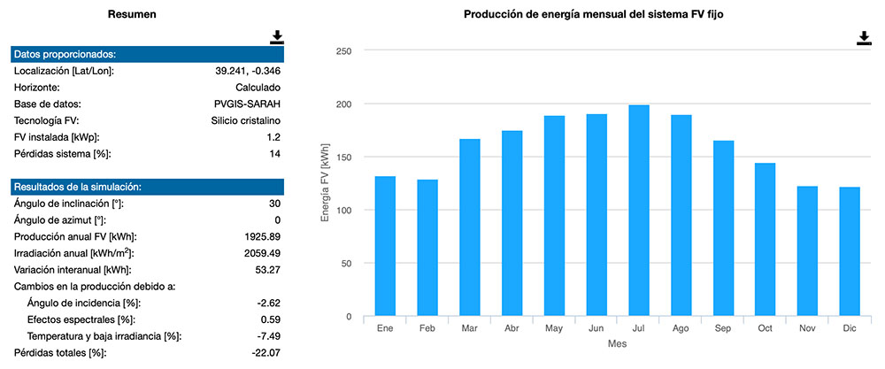 EJEMPLO DE PRODUCCION DE ESTE KIT EN VALENCIA (Fuente PVGIS ©Unión Europea, 2001-2021.):