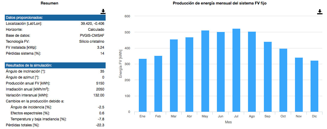 EJEMPLO DE PRODUCCION DE ESTE KIT EN VALENCIA (Fuente PVGIS ©Unión Europea, 2001-2017.):