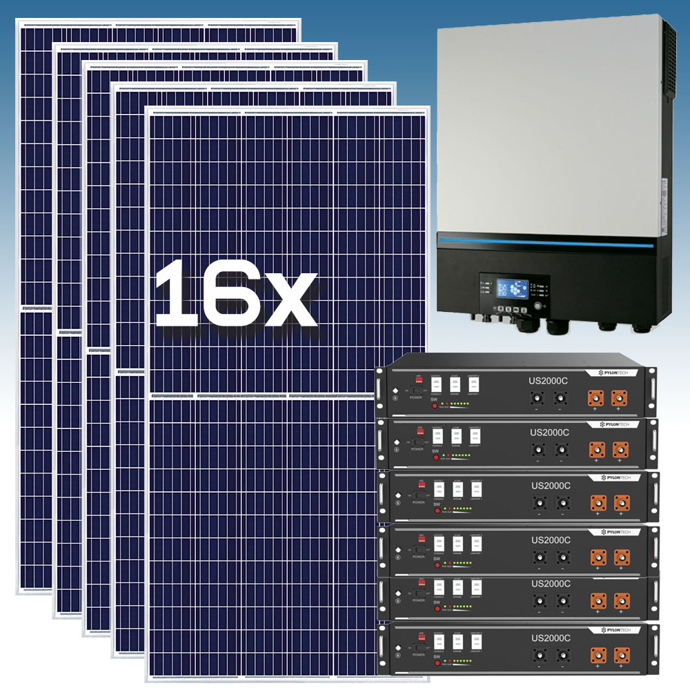 Kit Solar Fotovoltaico 19 kWh/dia con baterías de LITIO 14.4 hWh para consumos altos hasta 19 Wh/día con 6400Wp en paneles. Con inversor cargador y regulador integrado con función MPPT de 7200W a 48V.