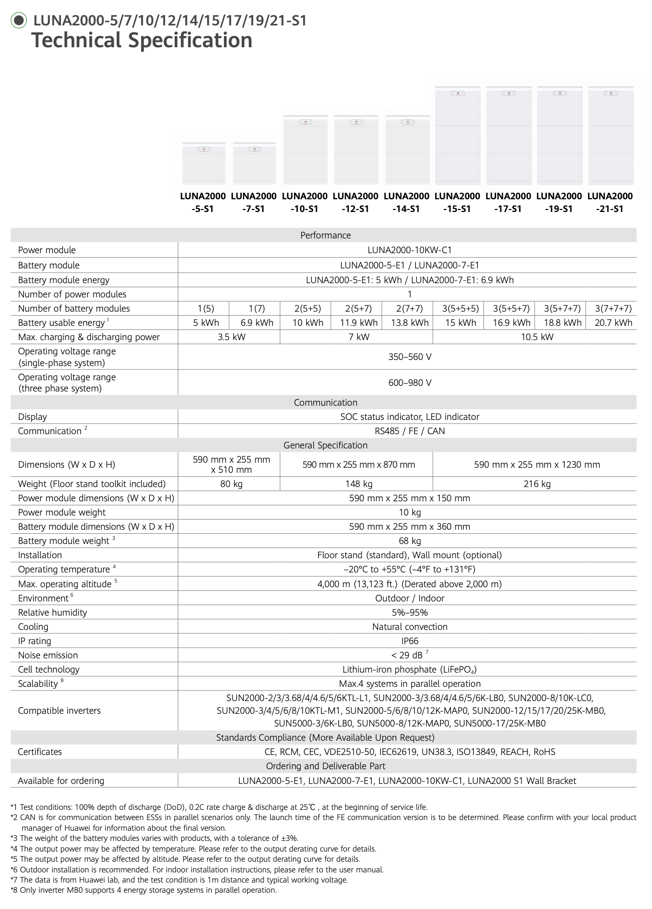Módulo de batería Huawei LUNA2000-5-E1 5 kWh. Necesita el Módulo de control.  Escalable hasta 3 módulos por módulo de control (20.7 kWh). Compatible con los modulos de 7kWh. Escalable hasta cuatro torres de baterías por inversor (con la gama MB0) y hasta 3 inversores con batería por instalación. Garantía de 15 años si se da de alta en el portal FusionSolar, en caso de no monitorizar la garantía será de 5 años.