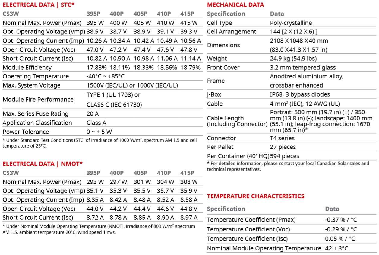 Los paneles solares del fabricante canadiense Canadian Solar HiKu ofrecen desde 395W a 415W de potencia, dependiendo del modelo elegido, y cuentan con 144 células. Fabricado con materiales de alta calidad que permiten un rendimiento óptimo en cualquier tipo de condiciones y entornos. Los paneles solares CanadianSolar HiKu cuentan con 10 años de garantía y certifican un rendimiento por encima del 83% durante al menos 25 años.