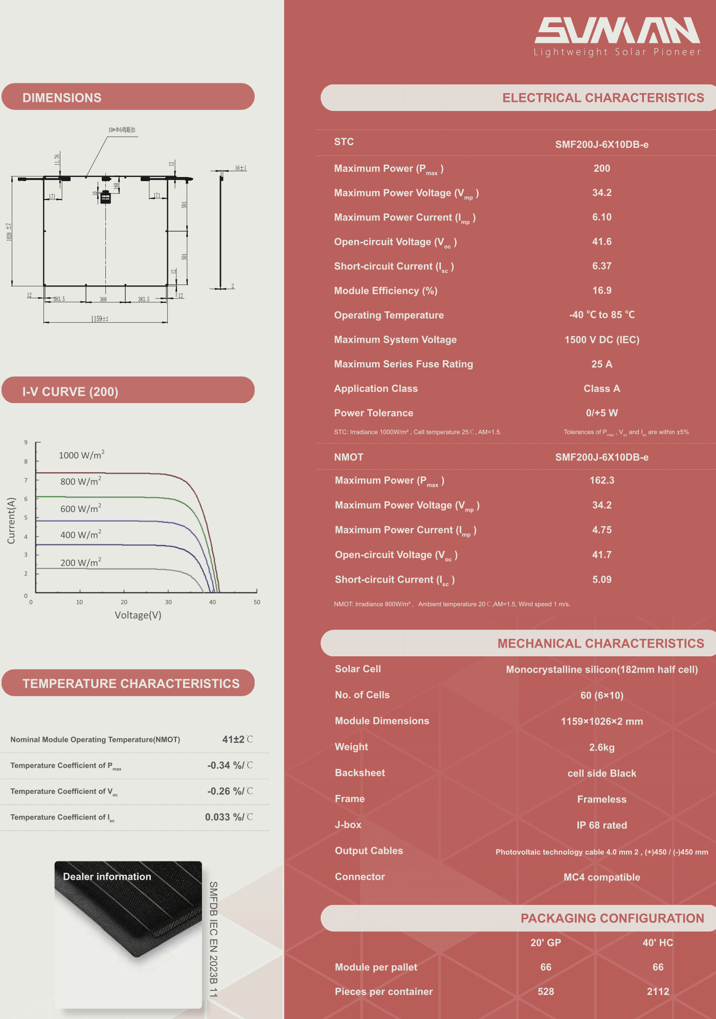 Placa Solar Flexible Sunman SMF200J-6X10DB-e 200W