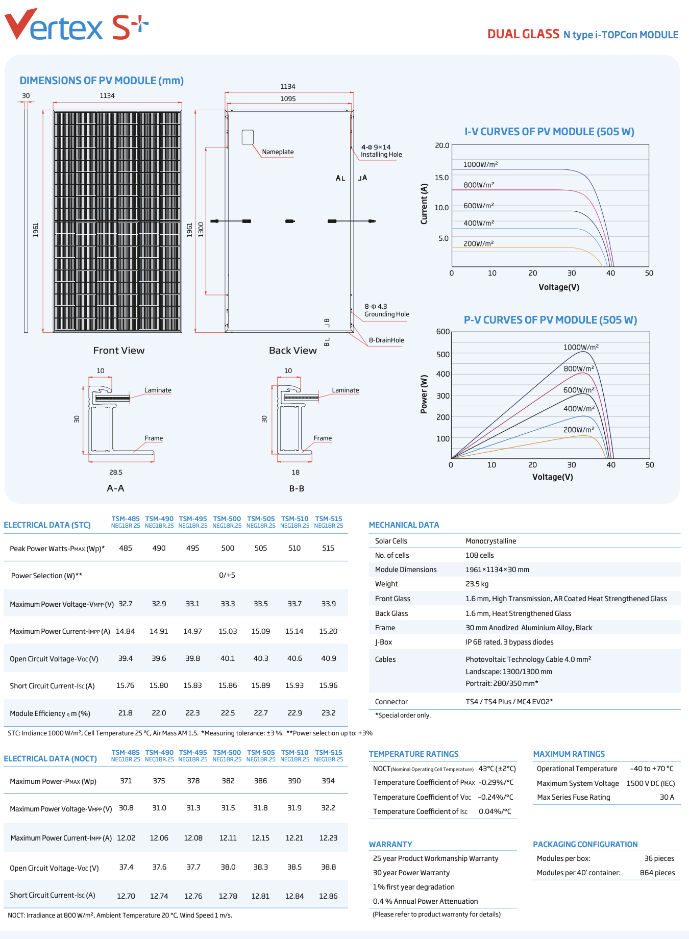 Placa Solar Trina Solar TSM-NEG18R.25 Full Black 505Wp. Módulo de doble cristal con tecnología TOPCon N-Typey potencia de 505W. Sus conectores son MC4-EVO2 y el cable es de 1400mm. El marco es negro y cuenta con garantía de producto de 25 años.