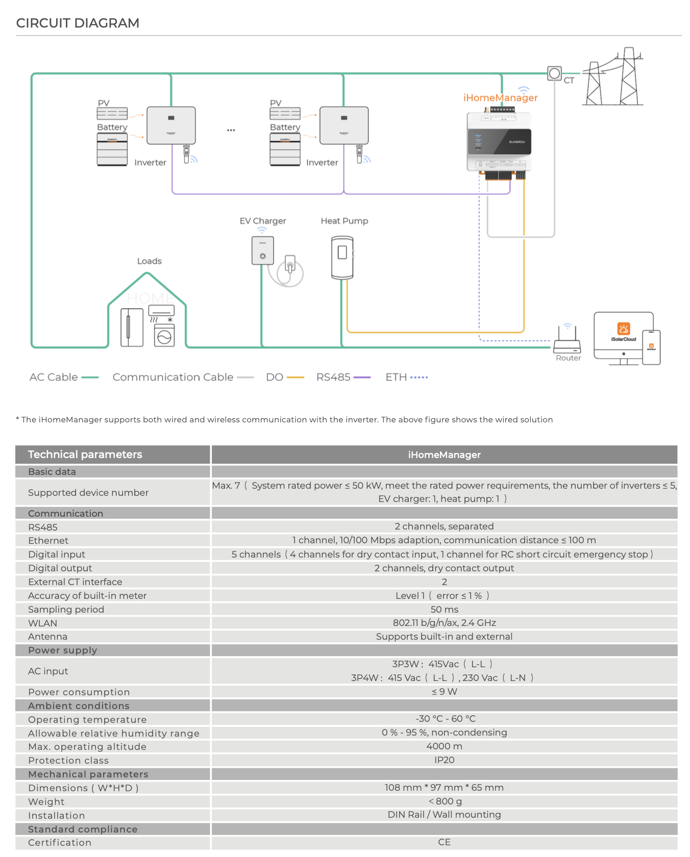 El iHomeManager de Sungrow es el centro de control inteligente para sistemas domésticos. Dado que está equipado con 3 conexiones CT cada una para el punto de conexión a la red y la generación local, no se requiere ningún contador de energía adicional en el sistema.
