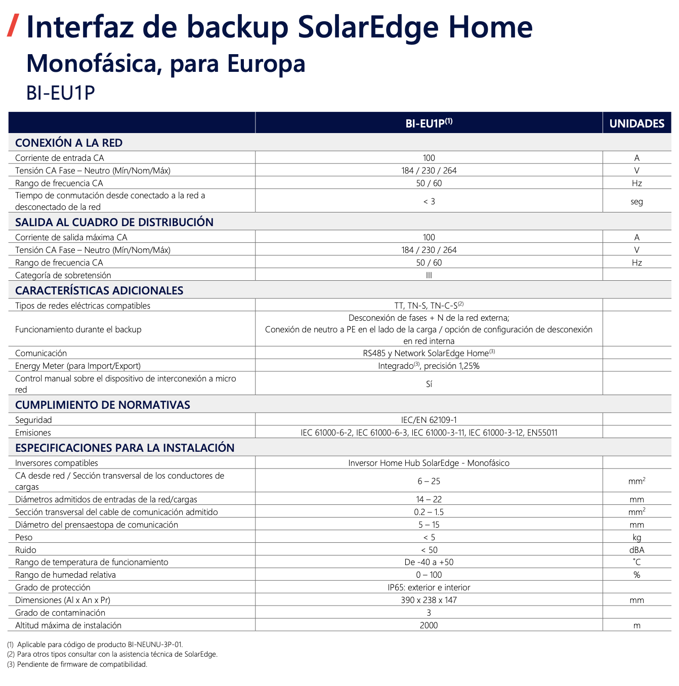 Interfaz de Backup para sistemas monofásicos con los inversores SolarEdge Home Hub y las baterías SolarEdge Home. Hasta 100A en AC.